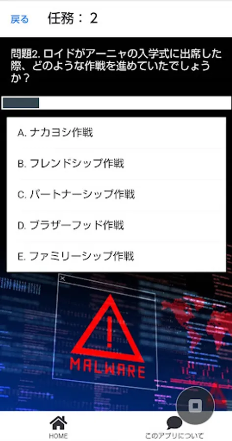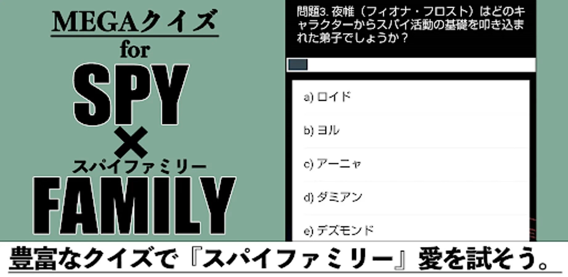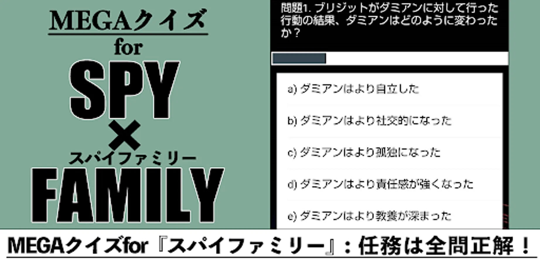 The MEGA Quiz for "Spy Family" killing time game app is the perfect tool for you to gain a deeper understanding of the world of "SPY x FAMILY" and test your knowledge. If you can answer all the quizzes, you'll be a true spy family game expert!