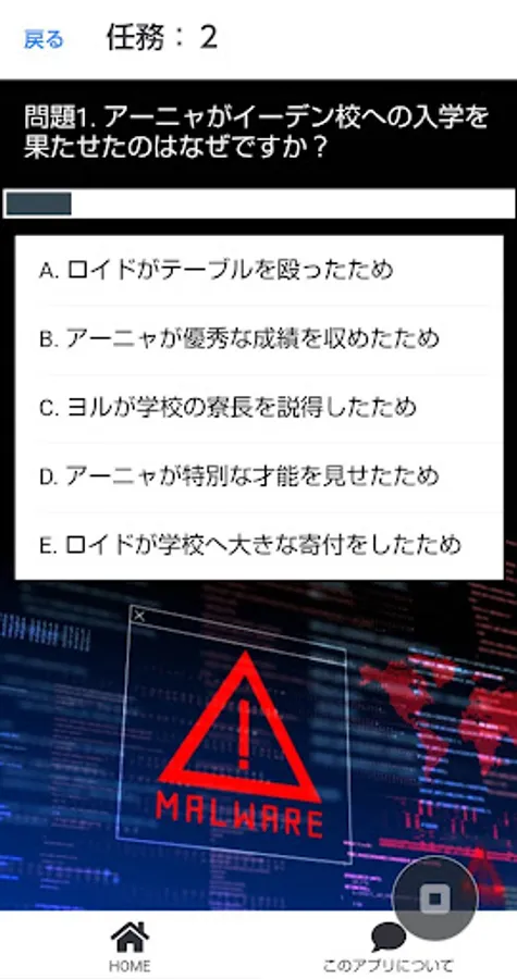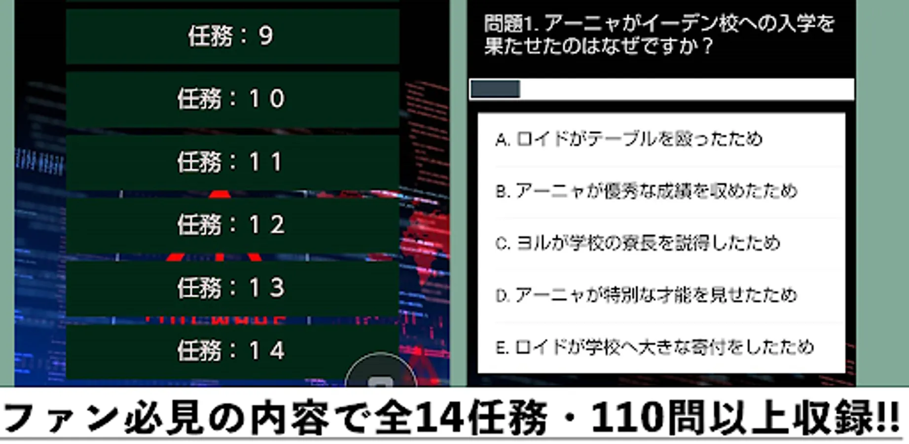 In particular, it includes quizzes that delve deeper into each character's fascinating story, including Anya's adorable behavior, Yoru's secret life, and Lloyd's skills as a spy. You will also be asked about various events that occur in the story and the complex relationships between characters.