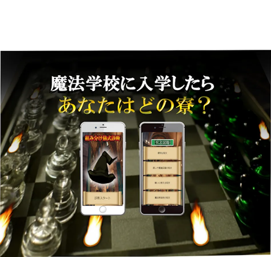 このアプリでは、あなたがもし魔法学校に入学したらどの寮に組み分けられるのかを占います。