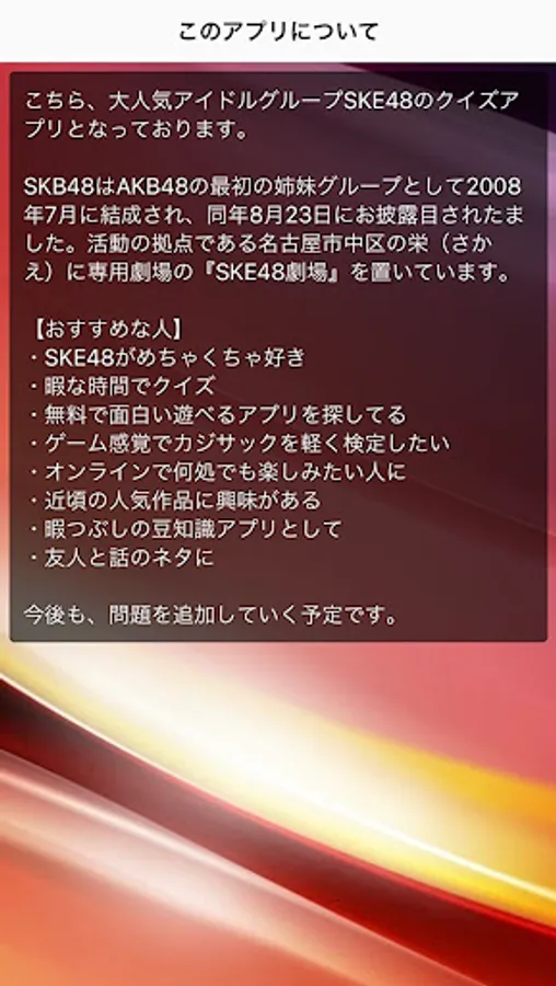 SKB48 was formed in July 2008 as the first sister group of AKB48 and was unveiled on August 23rd of the same year. We have a dedicated theater "SKE48 Theater" in Sakae, Naka-ku, Nagoya, which is the base of our activities.