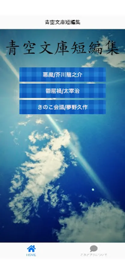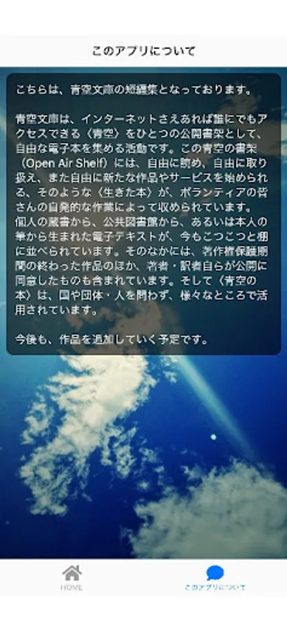 Aozora Bunko is an activity to collect free electronic books with , which can be accessed by anyone with the Internet, as one public book rack. Volunteers voluntarily work on this "living book" that can be read freely, handled freely, and started new works and services freely on this open air shelf. Is contained by.