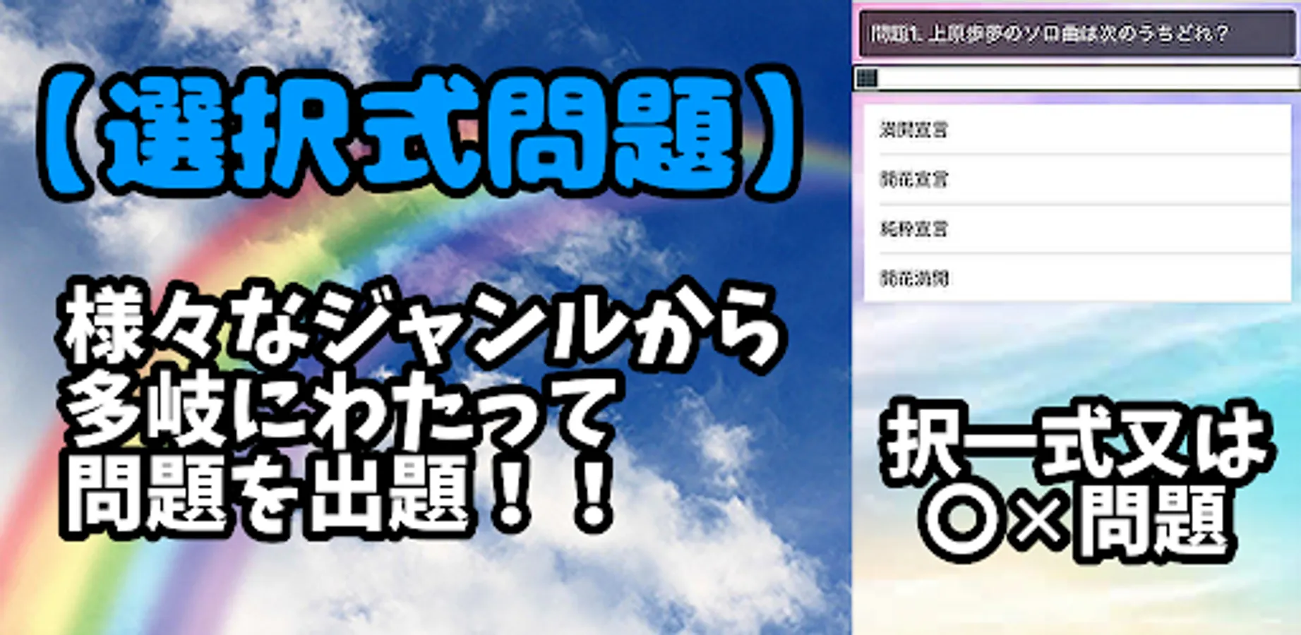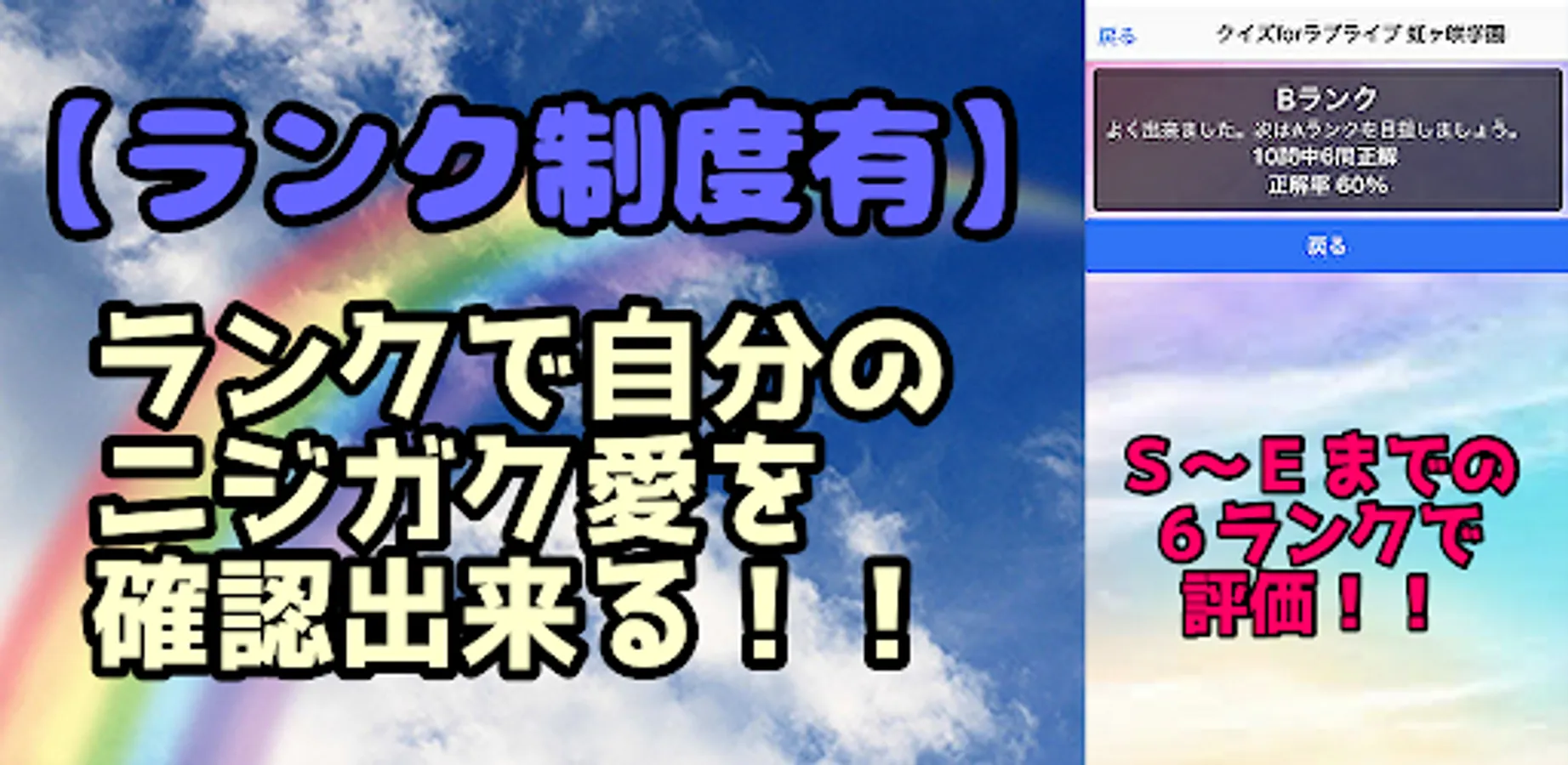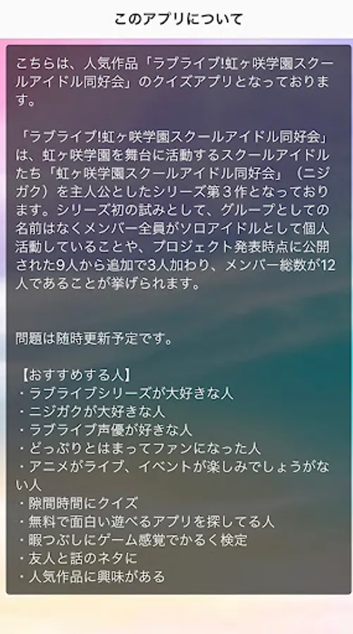 This is a quiz app for the popular work "Love Live! Nijigasaki Gakuen School Idol Club".