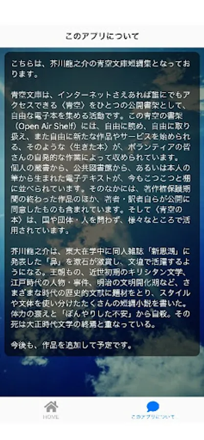 Aozora Bunko is an activity to collect free electronic books with , which can be accessed by anyone with the Internet, as one public book rack. Volunteers voluntarily work on this "living book" that can be read freely, handled freely, and started new works and services freely on this open air shelf. Is contained by.