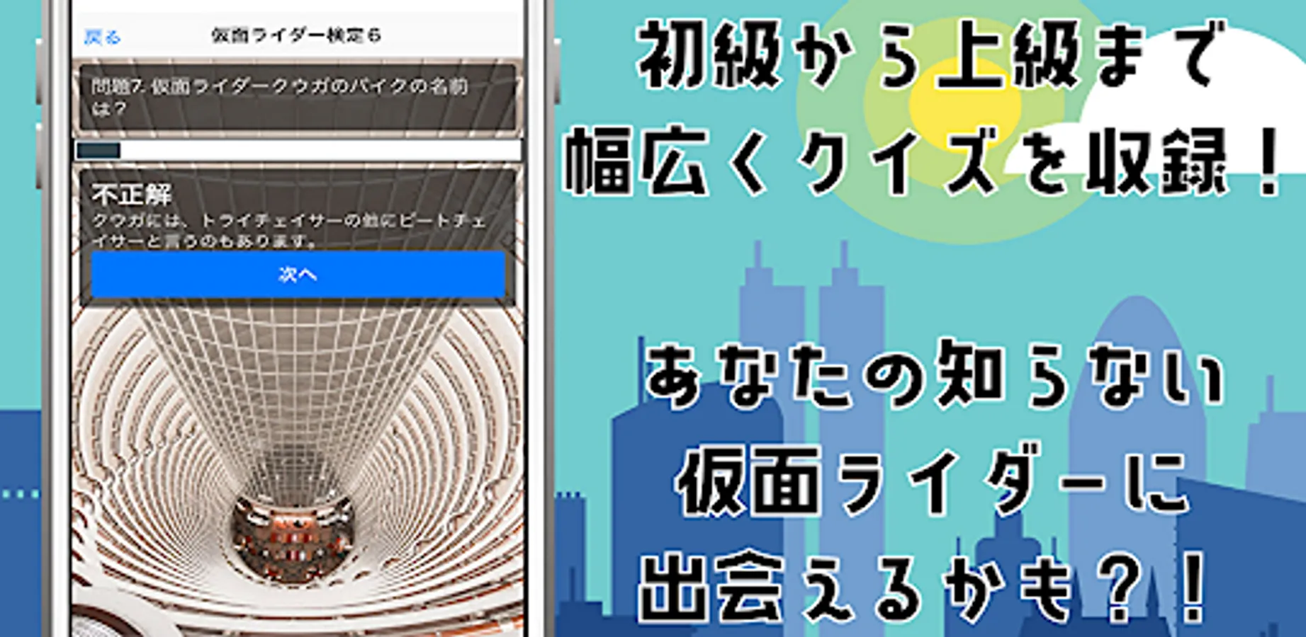 This quiz app is recommended for Kamen Rider fans and those who want to know more about Kamen Rider.