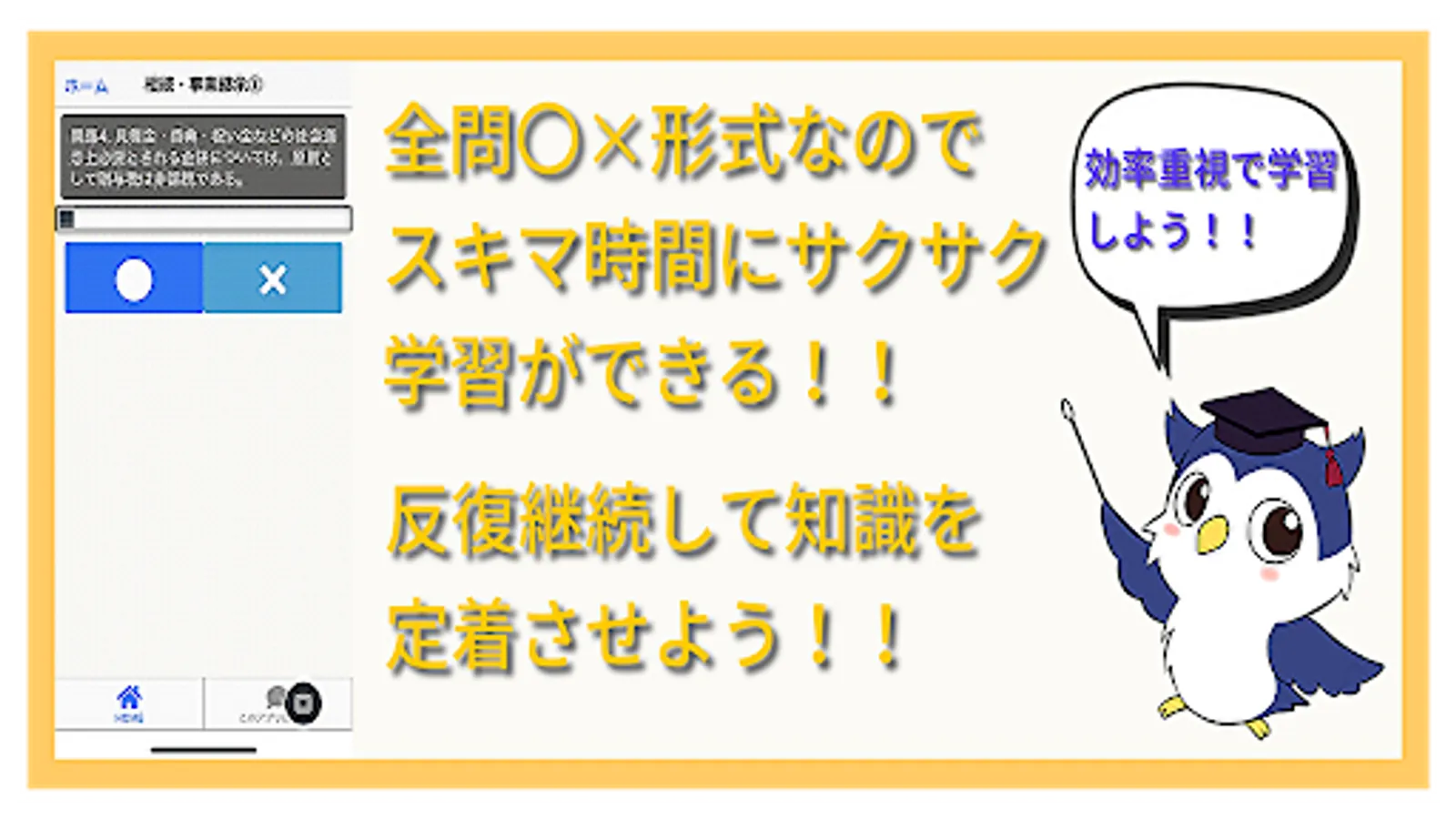 All the problems are in 〇 × format, and it is possible to proceed with learning quickly and efficiently even with a short gap time.