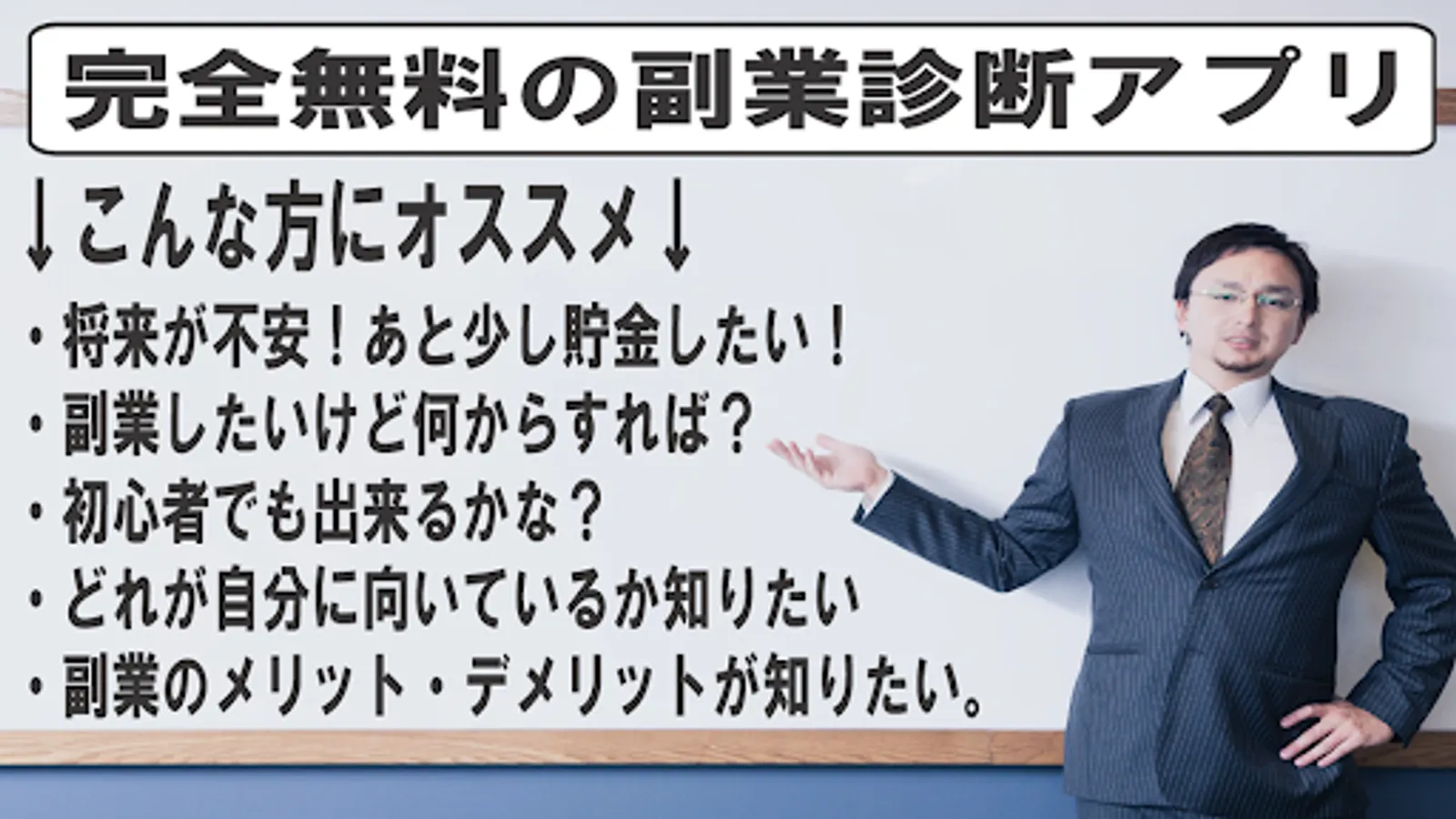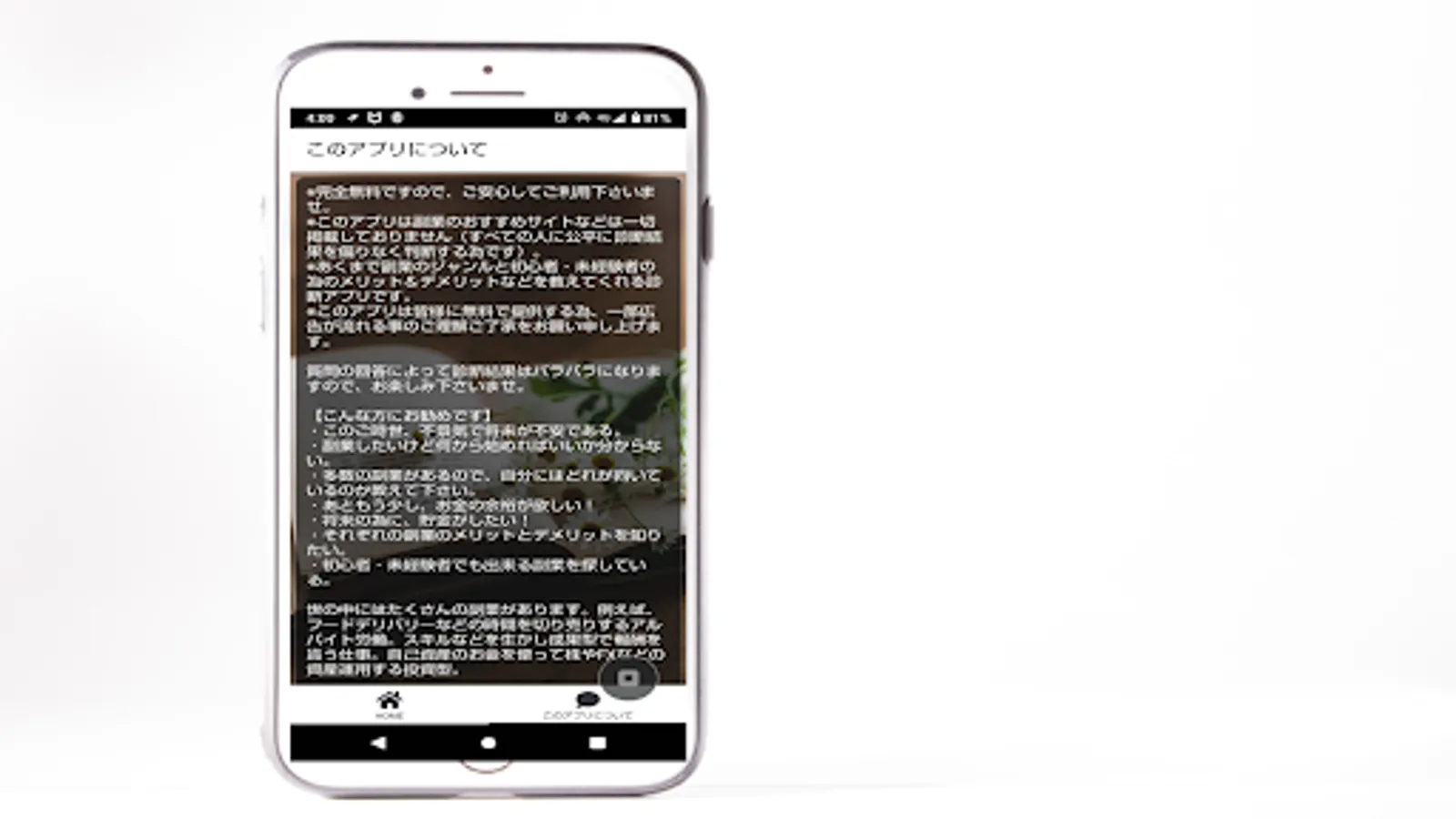 * It is a diagnostic app that tells you the genre of side business and the advantages and disadvantages for beginners and inexperienced people.