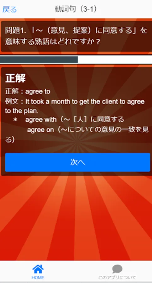 This app is divided into verb phrases and idioms. And the verb phrase is 10 questions x 4 = 40 questions,
