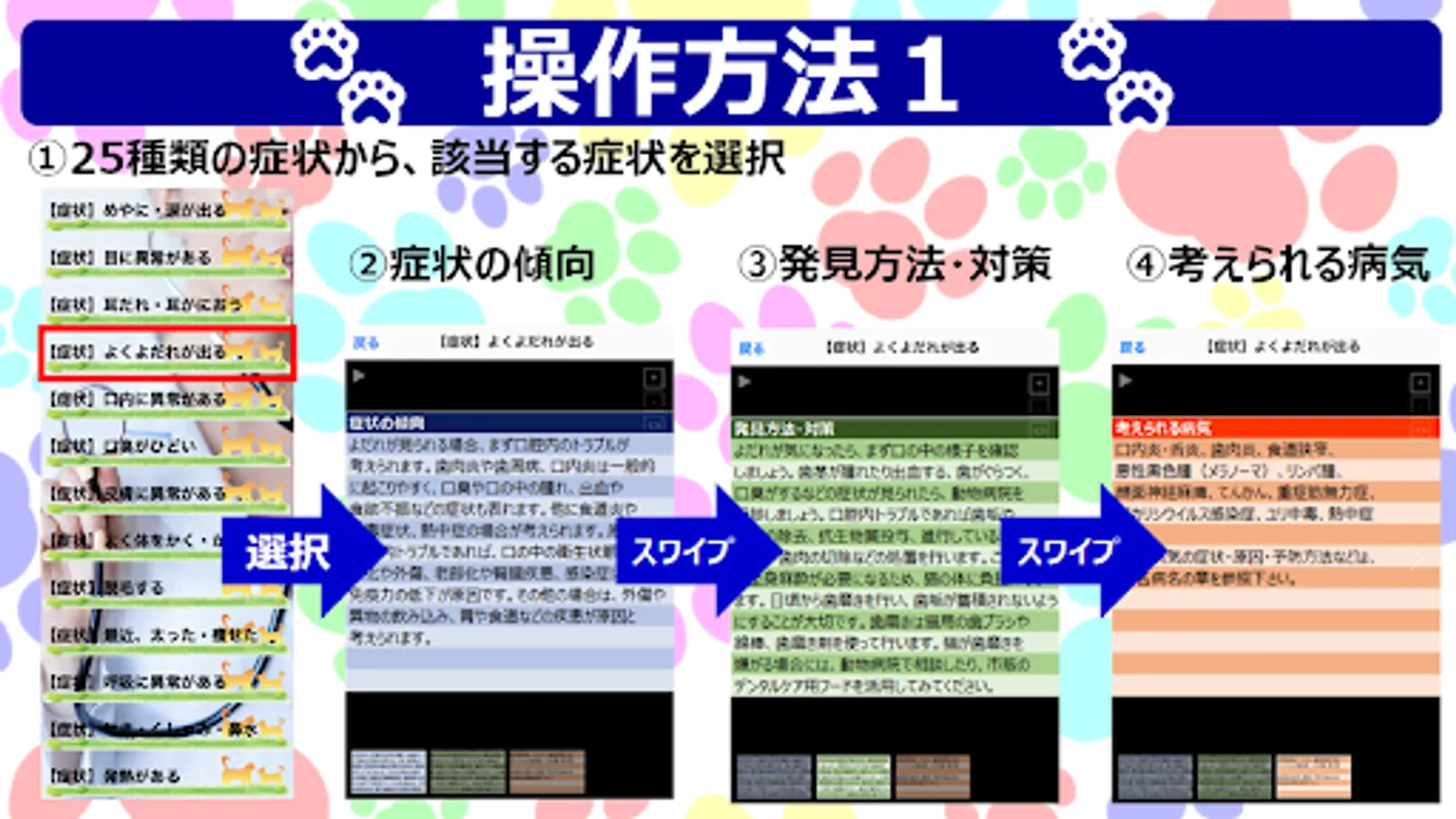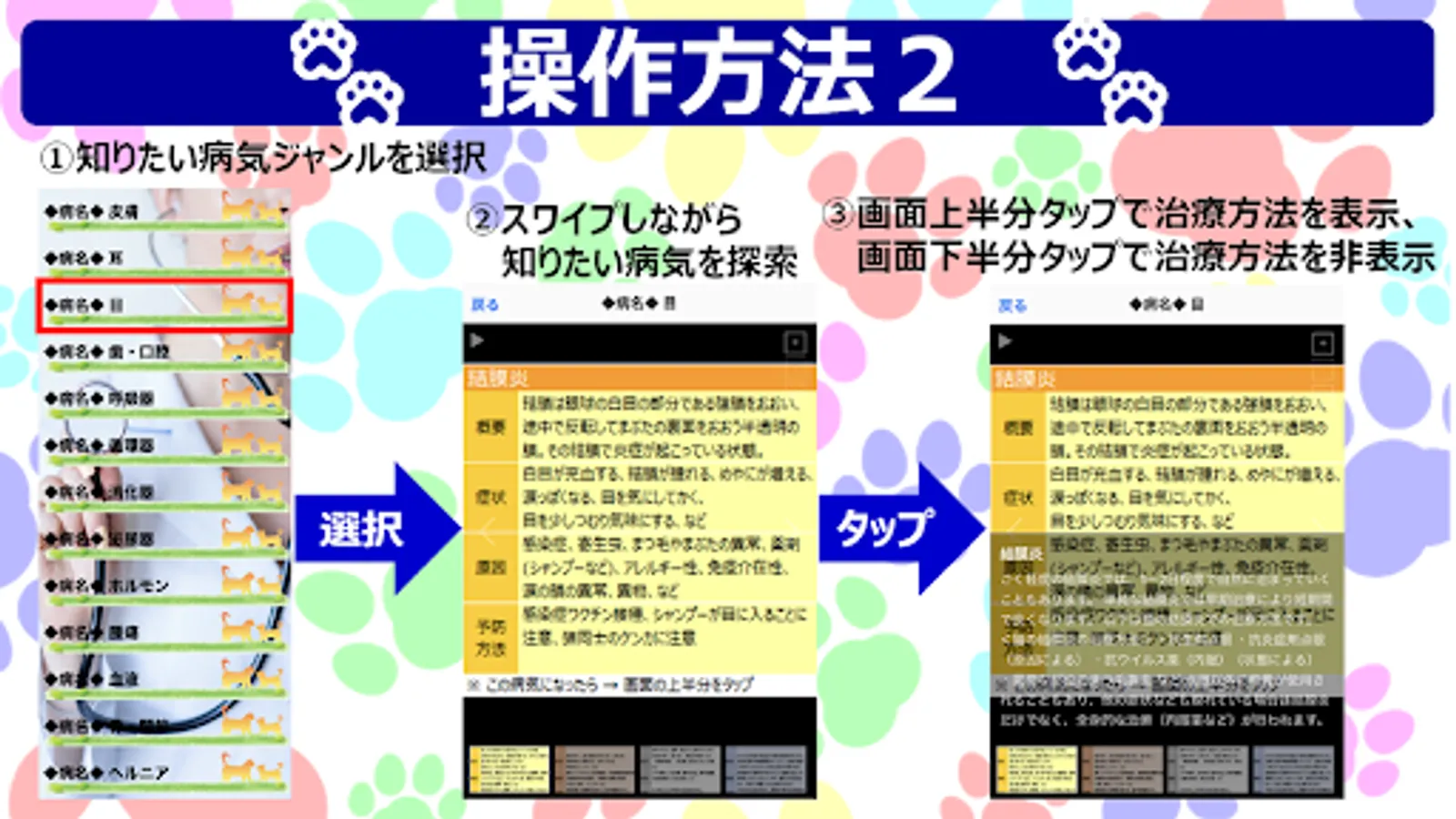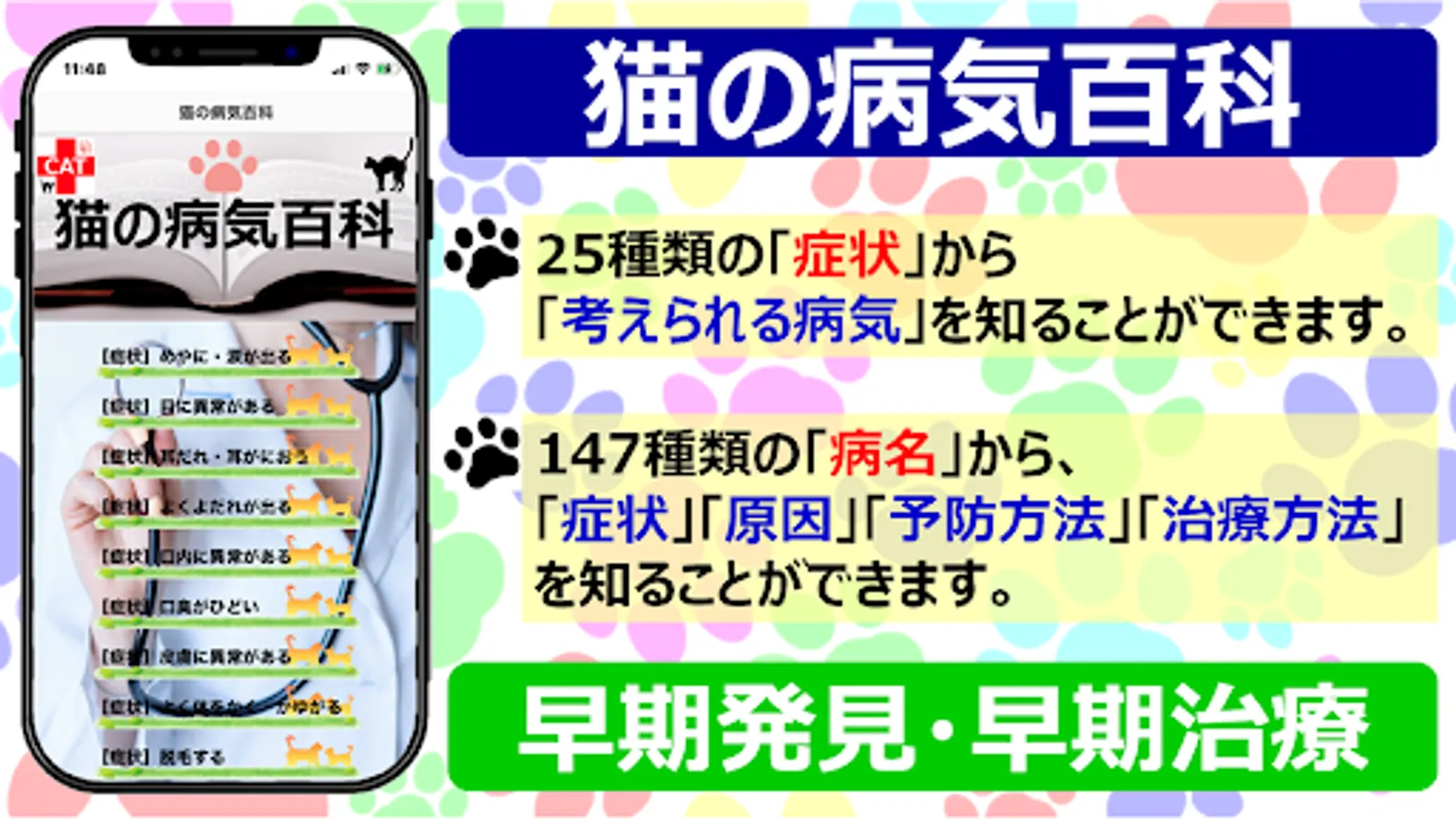 With this app, you can know "possible diseases" from 25 types of "symptoms". In addition, from 147 types of "disease names", you can know their "symptoms", "causes", "prevention methods" and "treatment methods".