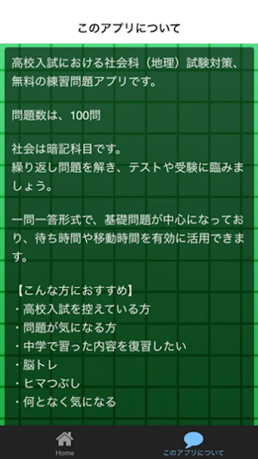 Social studies in high school entrance examination (geography) exam, is a free exercise app.