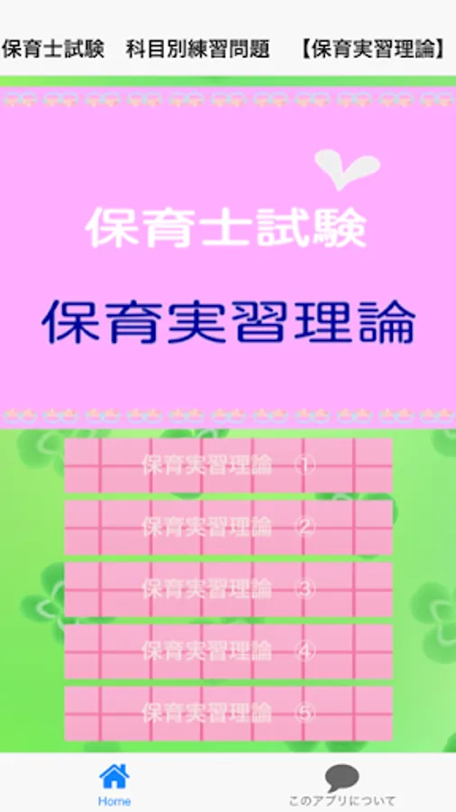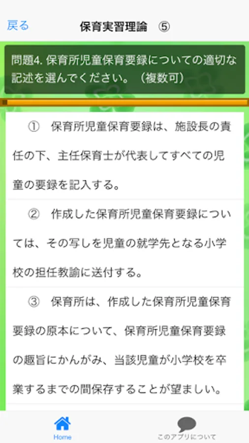 このアプリは、保育士筆記試験の過去問題より科目別【保育実習理論】の練習問題を掲載しています。