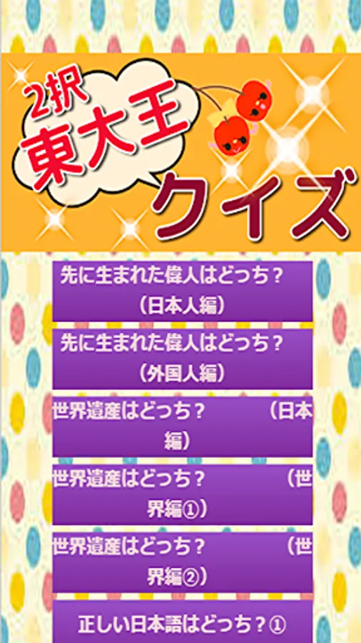 This is a quiz question that focuses on the two-choice questions among the questions that were asked in the past in the TV quiz program that is familiar on TV. I think that it is easy to answer because it is 2 choices. There are three genres: great people, world heritage, and correct Japanese.