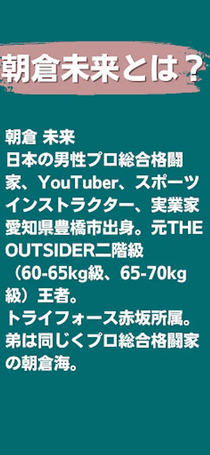 Born in Toyohashi City, Aichi Prefecture. Former THE OUTSIDER second class (60-65kg class, 65-70kg class) champion. Belongs to Triforce Akasaka. My younger brother is Kai Asakura, who is also a professional mixed martial arts fighter.