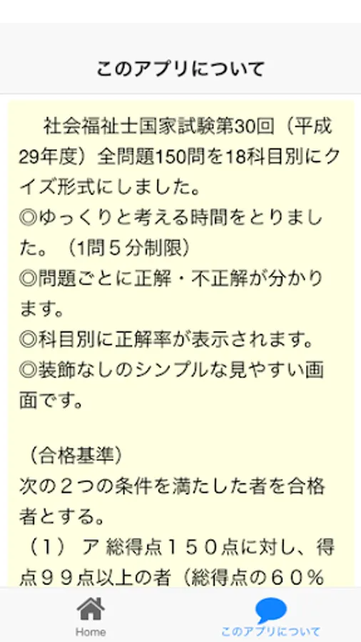 (1) ア 総得点150点に対し、得点99点以上の者(総得点の60%程度を基準とし、問題の難易度で補正した。配点は1問1点である。)。 イ 試験科目の一部免除を受けた受験者(社会福祉士及び介護福祉士法施行規則第5条の2)総得点67点に対し、得点43点以上の者(総得点の60%程度を基準とし、問題の難易度で補正した。配点は1問1点である。)。