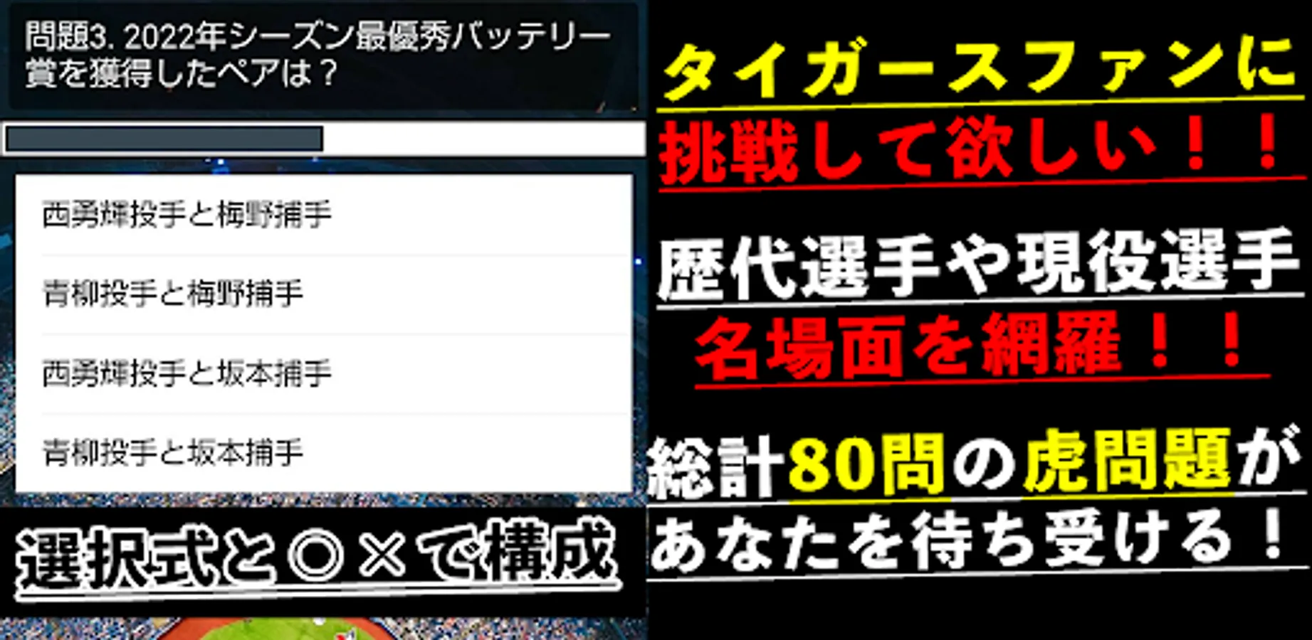 Through this app, you can deepen your knowledge of the Hanshin Tigers and have fun with fellow Hanshin Tigers fans. It also helps Hanshin Tigers fans to maintain their knowledge of the Tigers even during the off-season or busy times, as they can enjoy the quiz anytime, anywhere.