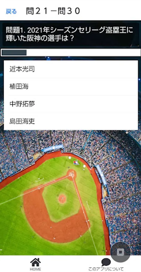 When you start the app, you can challenge the quiz. Quiz genres include Hanshin Tigers players and managers, ballparks, cheering songs, history, and many other areas. The questions are multiple-choice questions, so you can easily answer just by choosing the correct answer. By answering the quiz correctly, the score is added and the scoring function is attached.