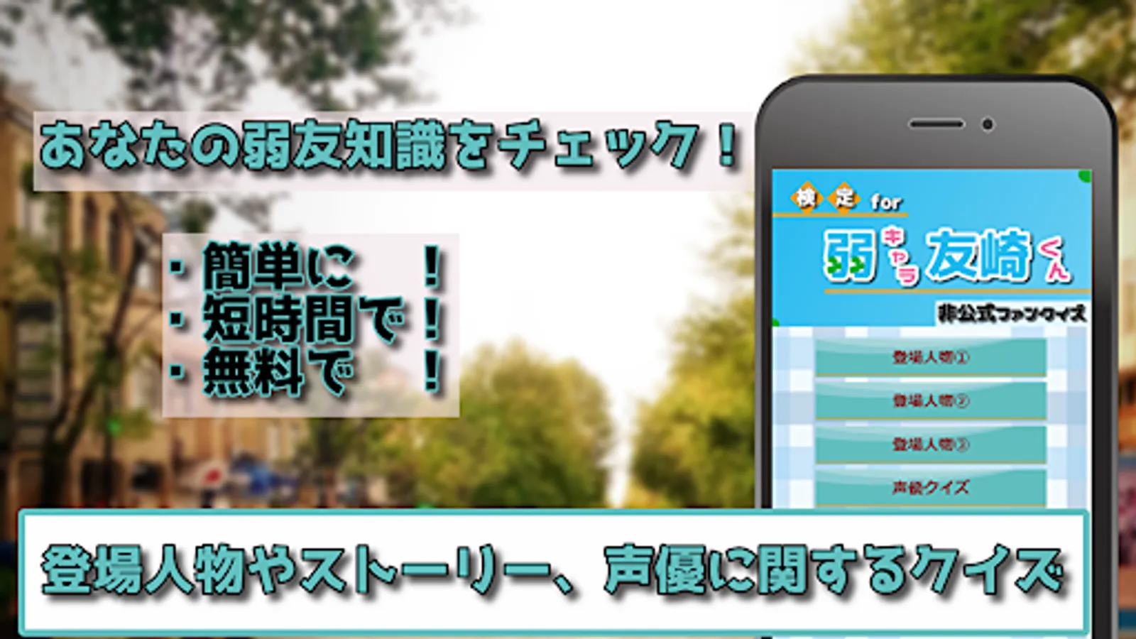 It is an unofficial weak character Tomozaki-kun's quiz app!