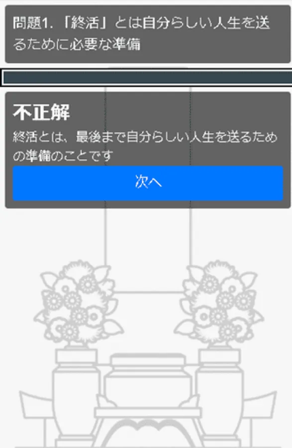 In this quiz app, you will be asked questions in a quiz format that you should remember at the end of life.