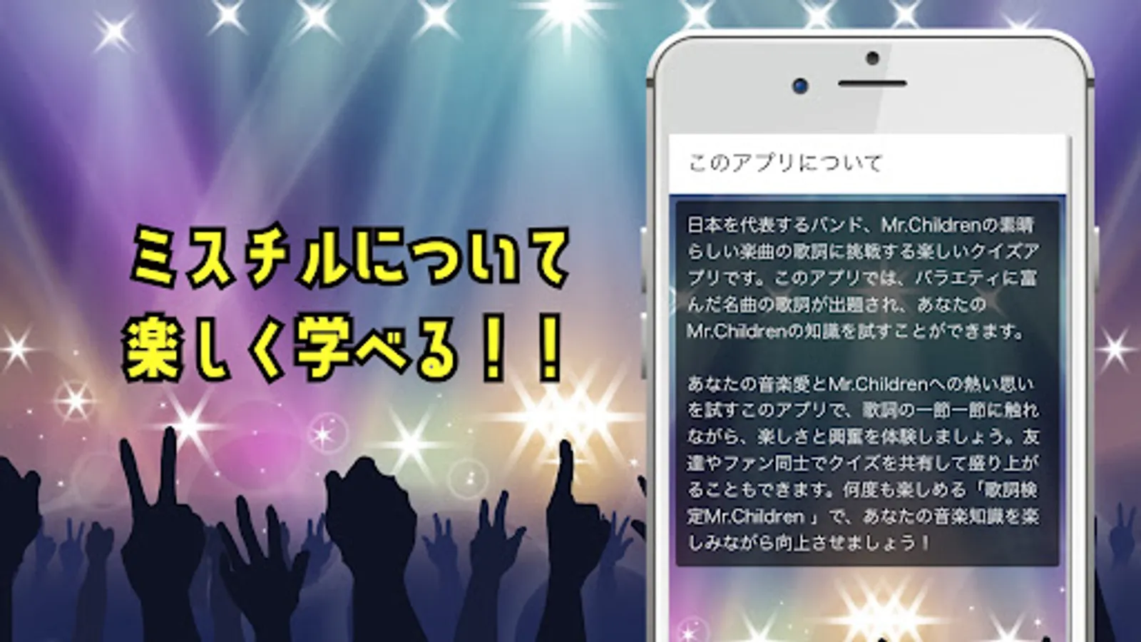 This is a fun quiz app that challenges the lyrics of wonderful songs by Japan's leading band, Mr.Children. In this app, you can test your knowledge of Mr. Children with a wide variety of famous song lyrics.