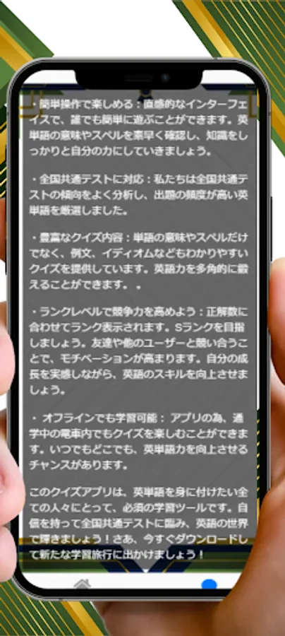 ・ Can be learned offline: Because it is an app, you can enjoy quizzes even on the train while commuting to school. Anytime, anywhere you have the chance to improve your English vocabulary.