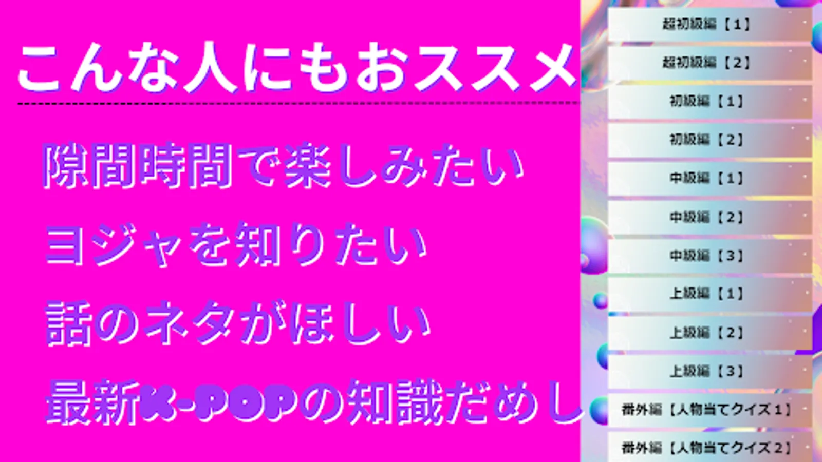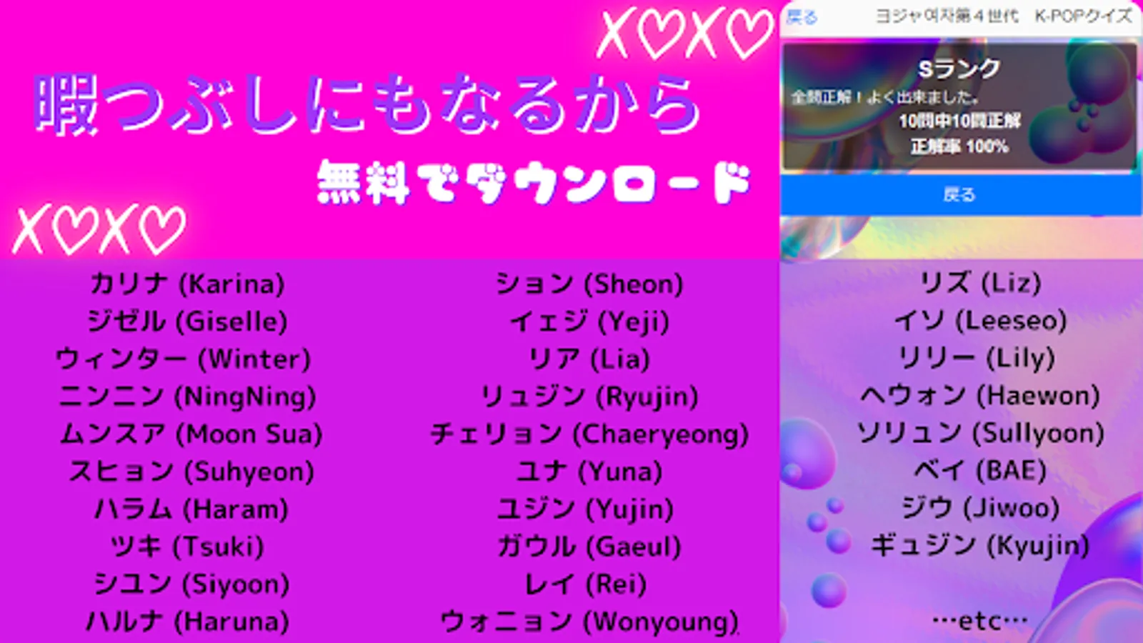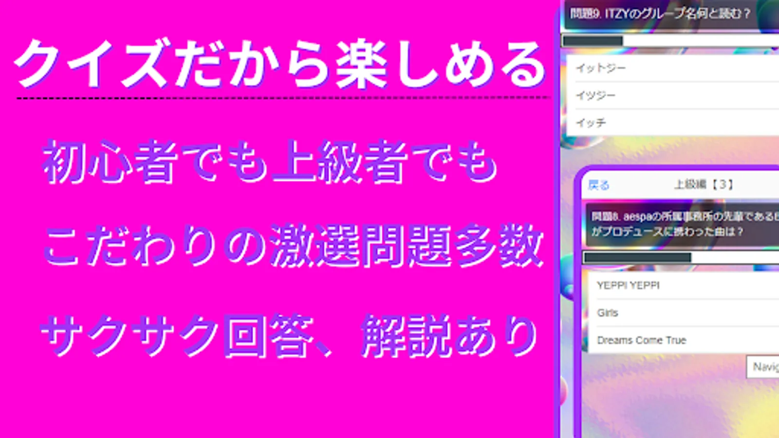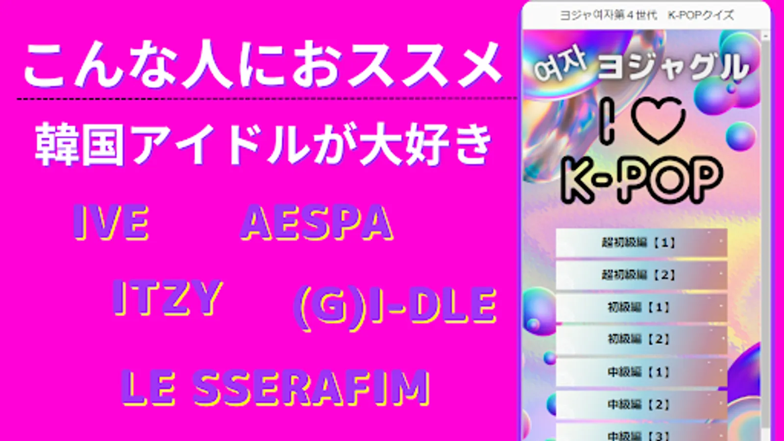 A fun and knowledge-testing quiz app for people who are into the latest Korean pop music scene! Idol groups ITZY, aespa, (G) I-DLE, IVE, LE SSERAFIM, New Jean, NMIXX, Kep1ar, STAYC, Billie, and more.