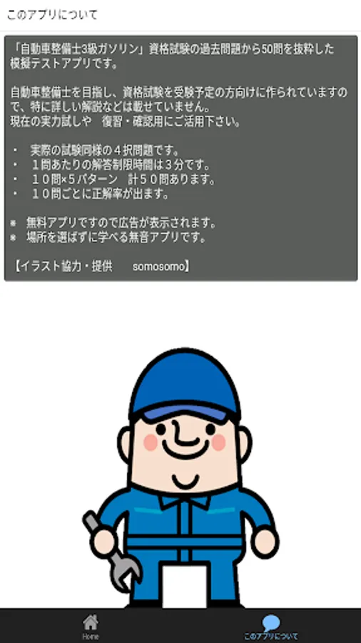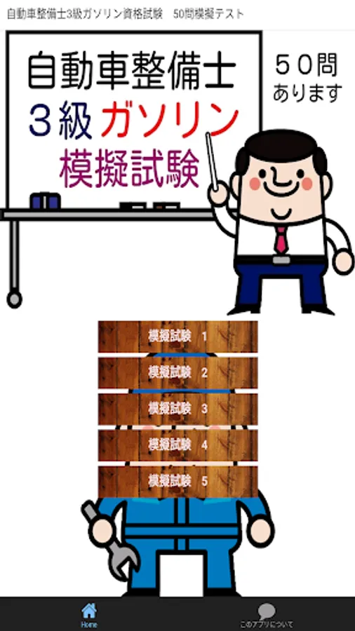 「自動車整備士3級ガソリン」資格試験の過去問題から50問を抜粋した 模擬テストアプリです。