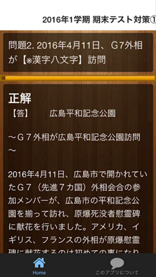 このアプリでは 中学生・高校生を対象とした「時事問題のテスト対策」として 中間テスト・期末テストに出題されそうなものをクイズ形式(文字入力形式)で出題しています。