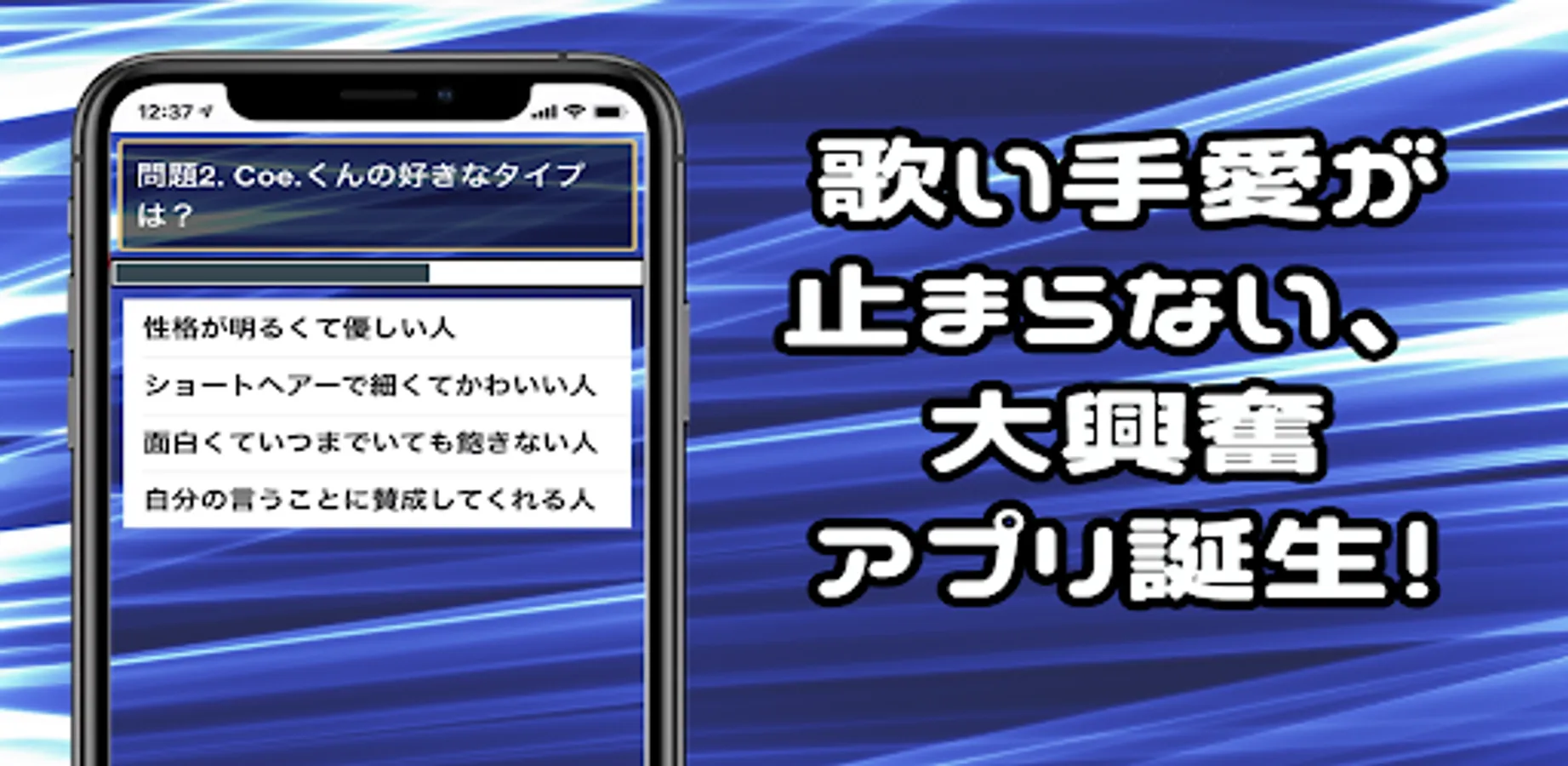 This app offers a brand new gaming experience where the members of a popular singer group quiz you. Yu Kisaragi, Kuni, Kotaro, Relu, Coe.