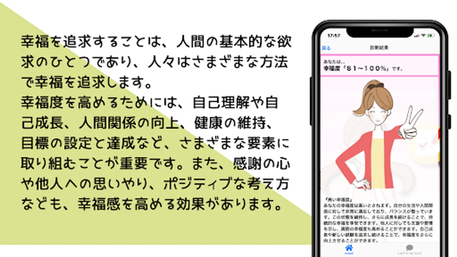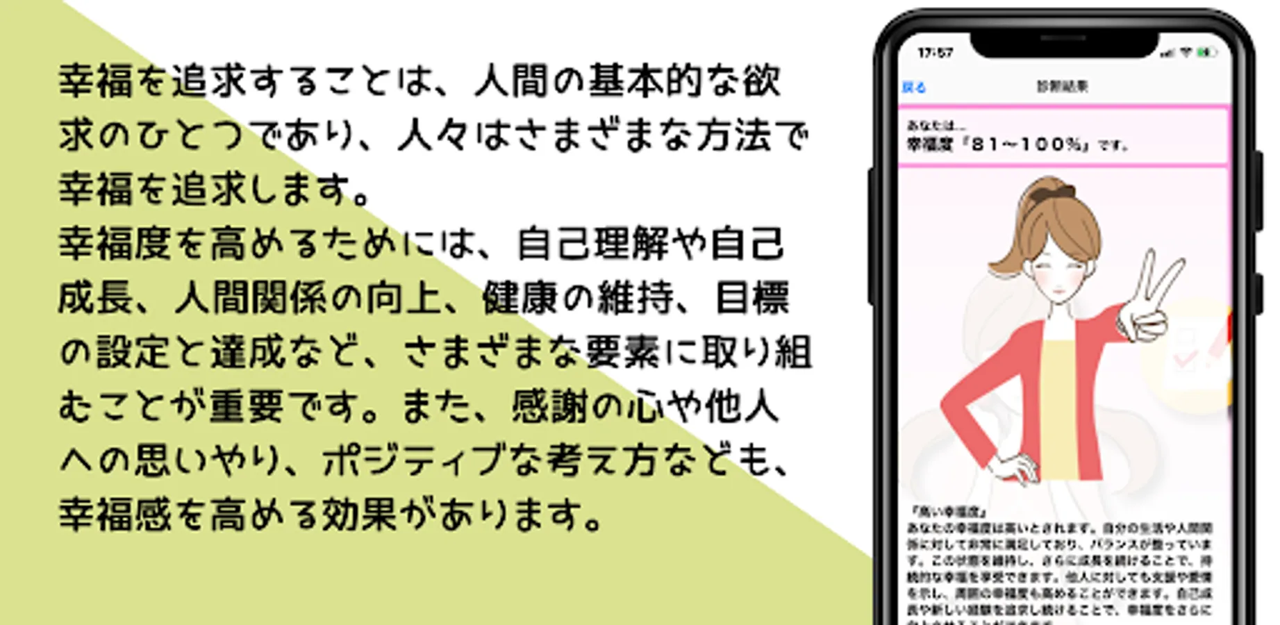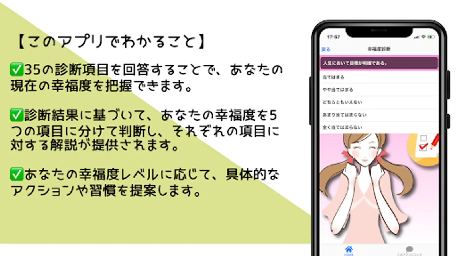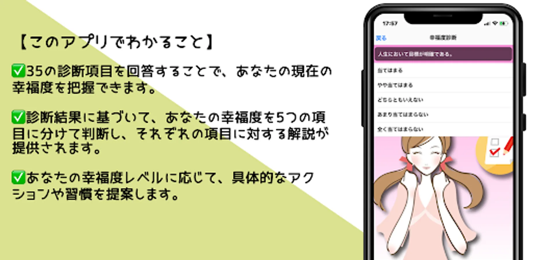 このアプリは、あなたの幸福度を測定し、より幸せな人生を送るための指針を提供します。35の診断項目を通じて、自分の幸福度を評価し、5つの項目に分けて判断します。この結果をもとに、あなたに合った幸福度向上のためのアドバイスや秘訣を提案します。