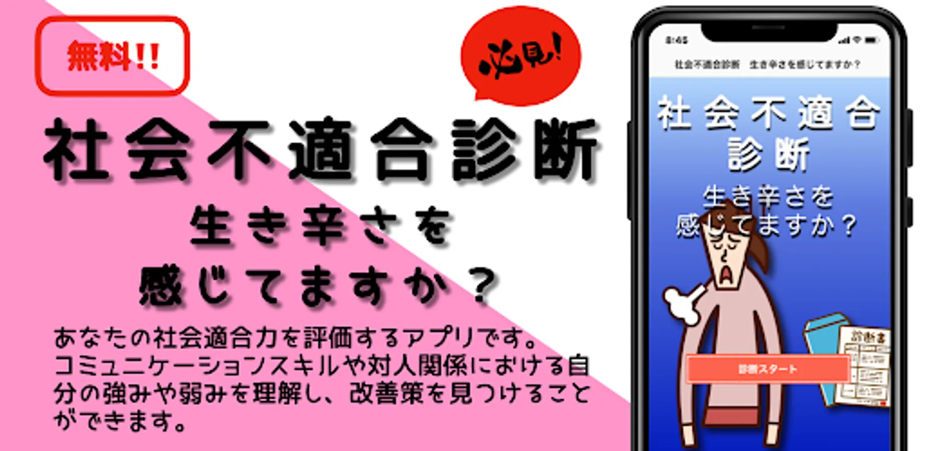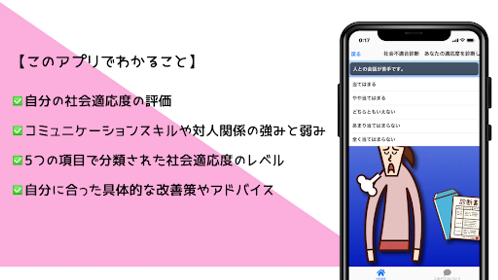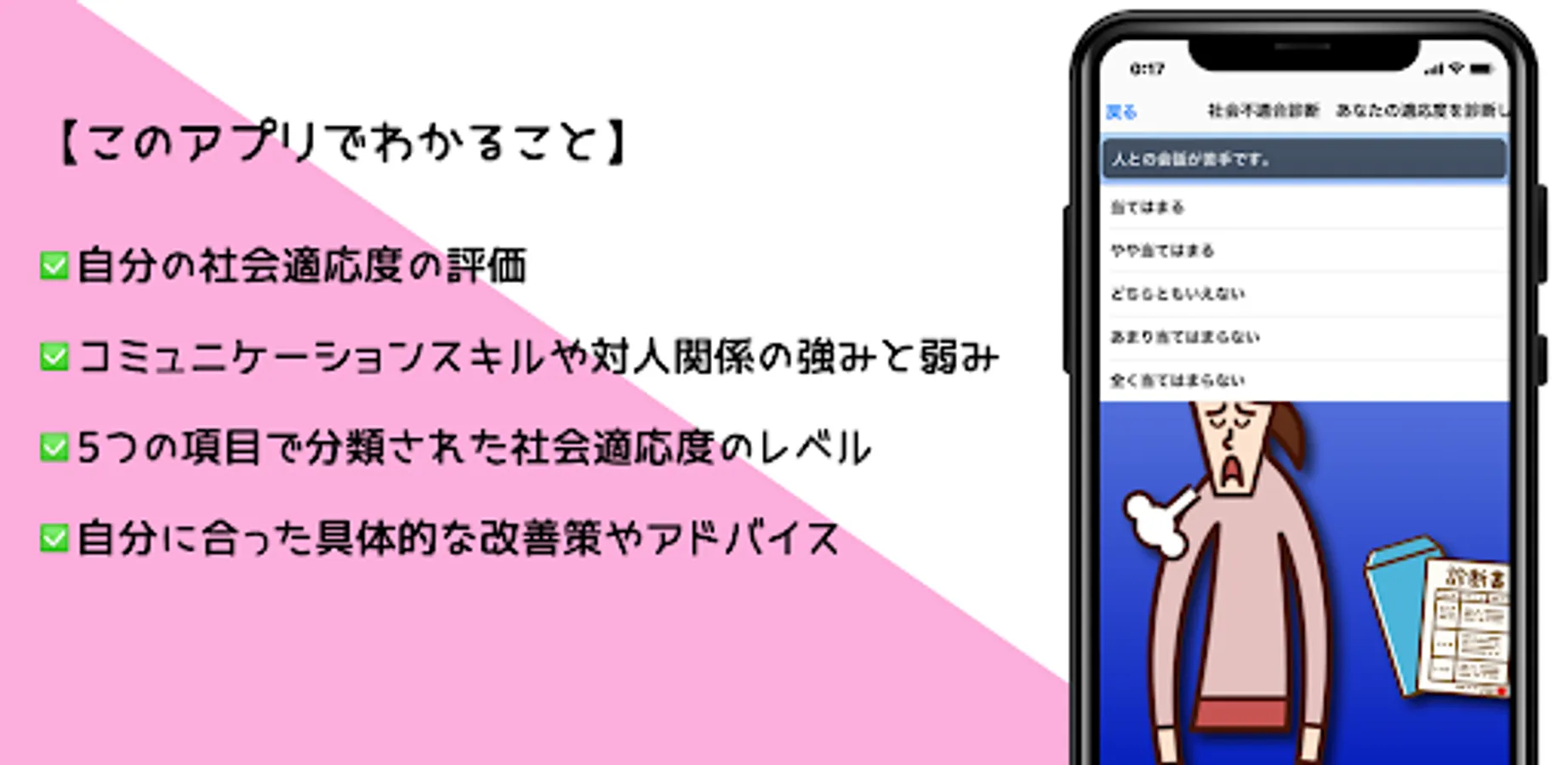 "Social Misfit Diagnosis" evaluates your social fitness based on 35 questions and displays the results divided into 5 items. Based on the results, we provide specific improvement measures and advice to help you build better relationships.
