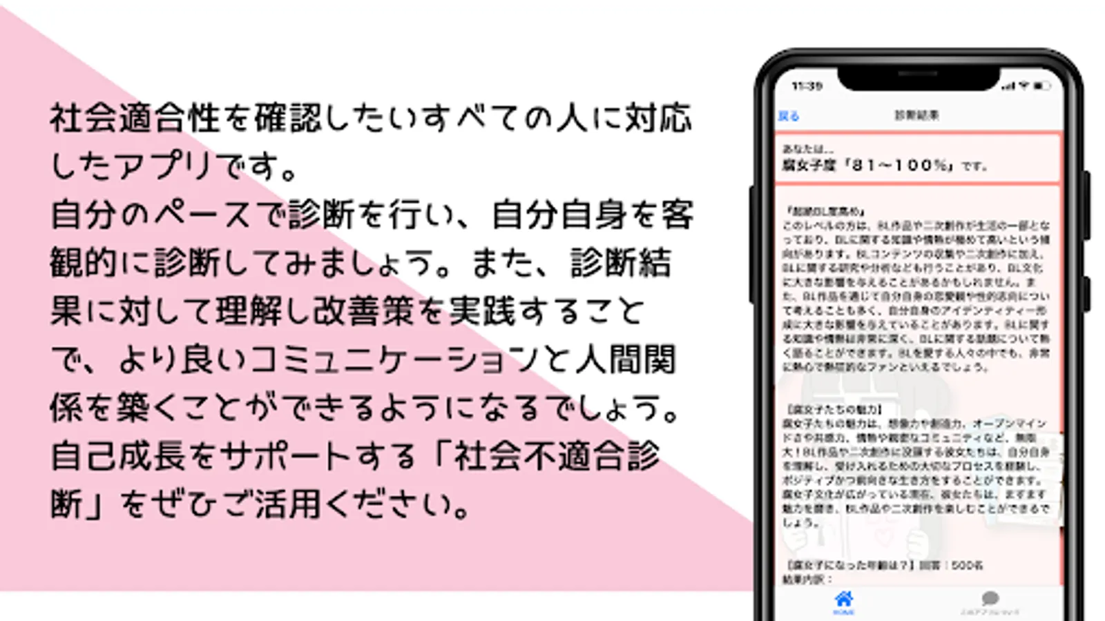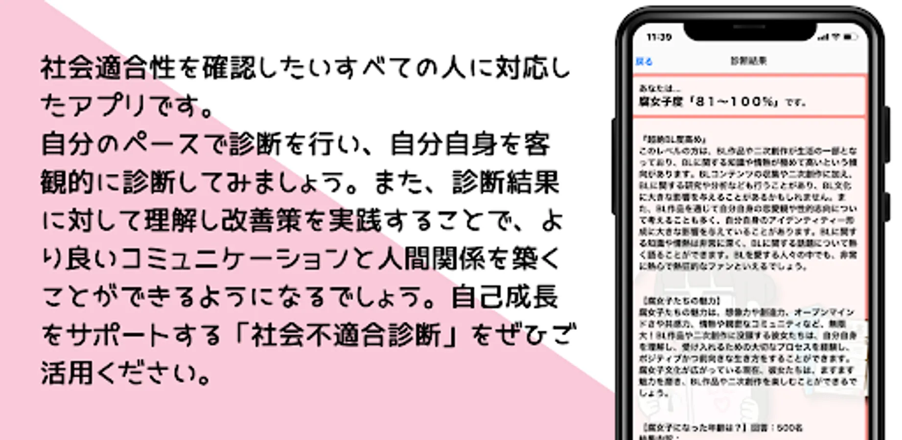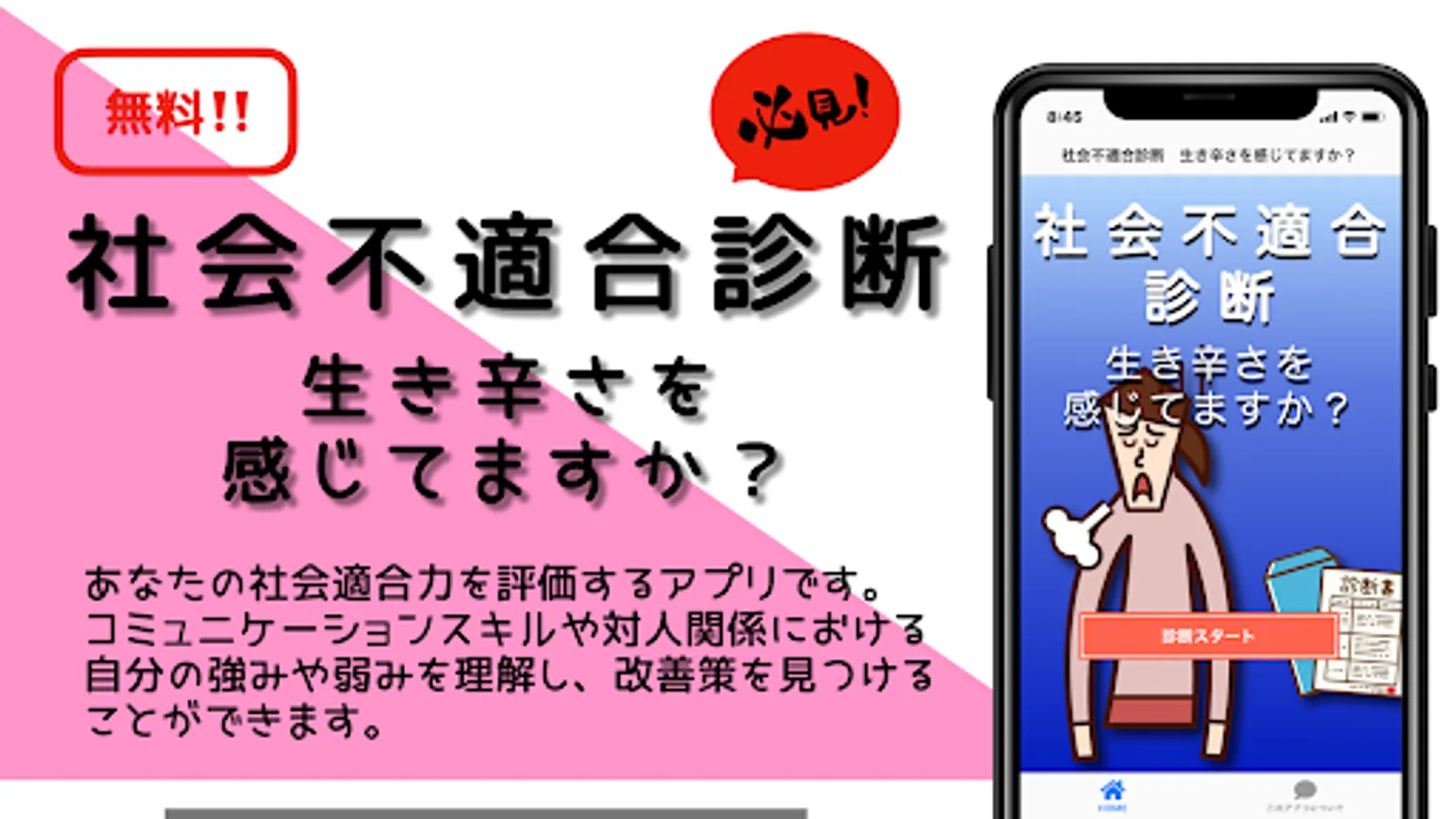 "Social Misfit Diagnosis" evaluates your social fitness based on 35 questions and displays the results divided into 5 items. Based on the results, we provide specific improvement measures and advice to help you build better relationships.