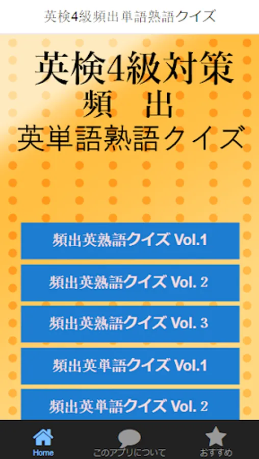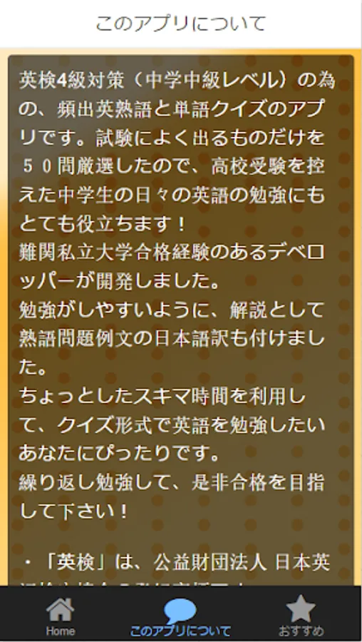 英検4級対策(中学中級レベル)の為の、頻出英熟語と単語クイズのアプリです。