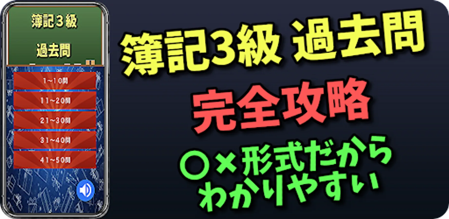 It is an application that can completely capture the past questions of bookkeeping 3rd grade in 〇✖ format. The app contains the latest past questions, all in 〇✖ format. This allows you to efficiently solve past questions and improve your understanding. If you aim to pass bookkeeping level 3, this app is perfect.