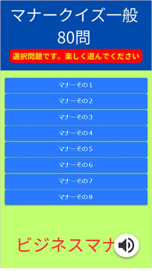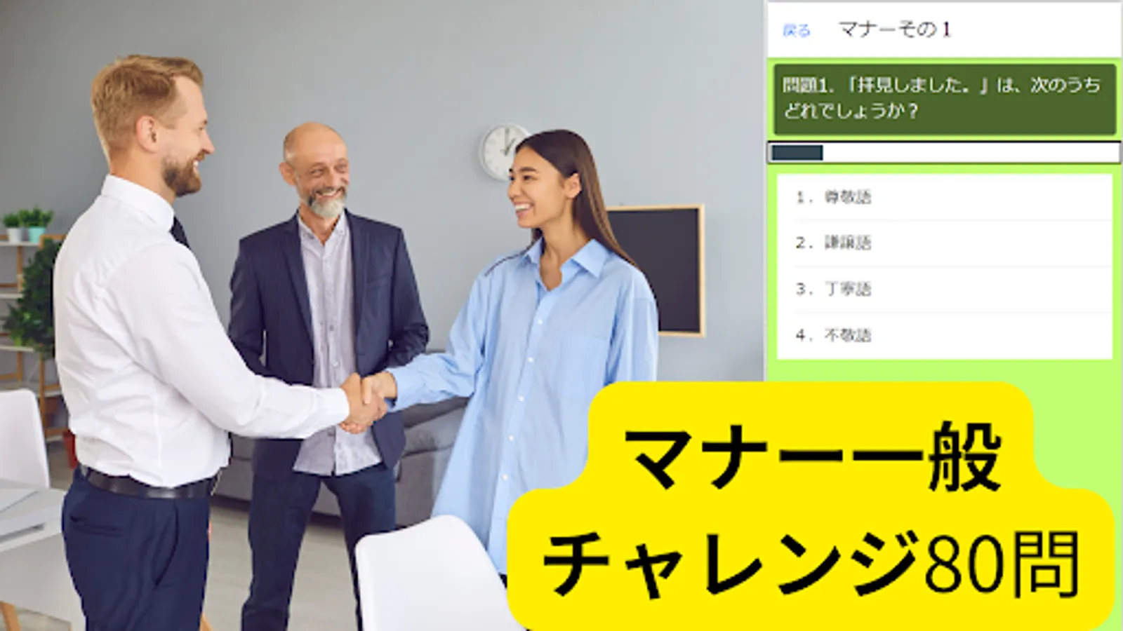 General manners were made into a quiz format. A wide range of manners from daily life to business are made into 80 quizzes. Please wear good manners while having fun.