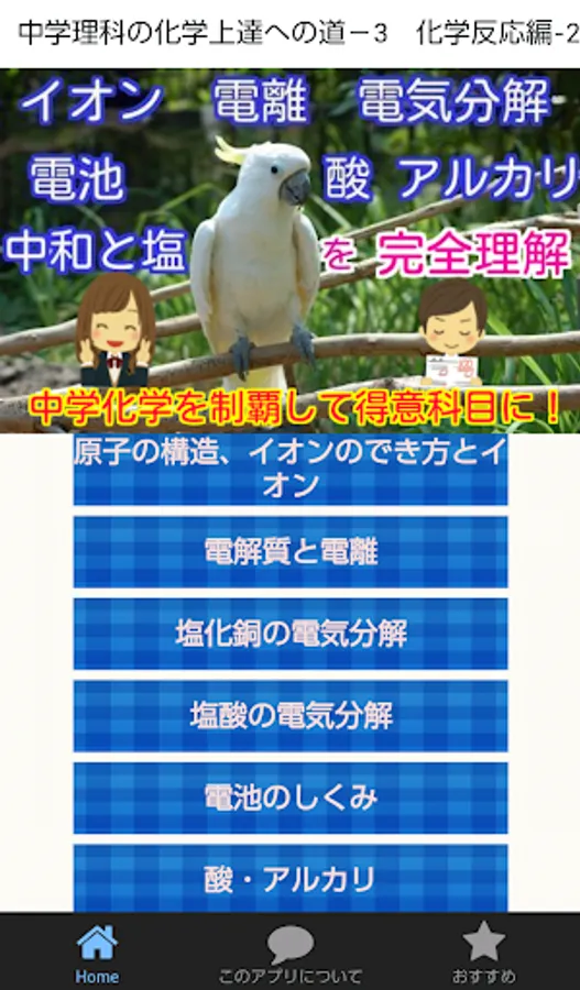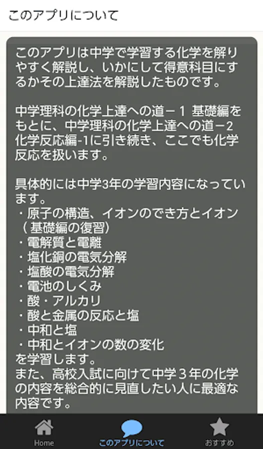 このアプリは中学の教科書で学習する化学を解りやすく解説し、いかにして得意科目にするか、そのマスターへの道を解説した参考書のようなものです。