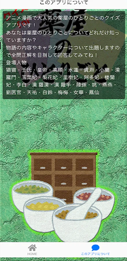 It is a quiz app for each pharmacy popular in anime manga!
