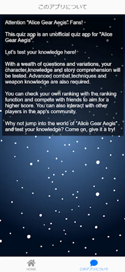 This quiz app is an unofficial quiz app for "Alice Gear Aegis".