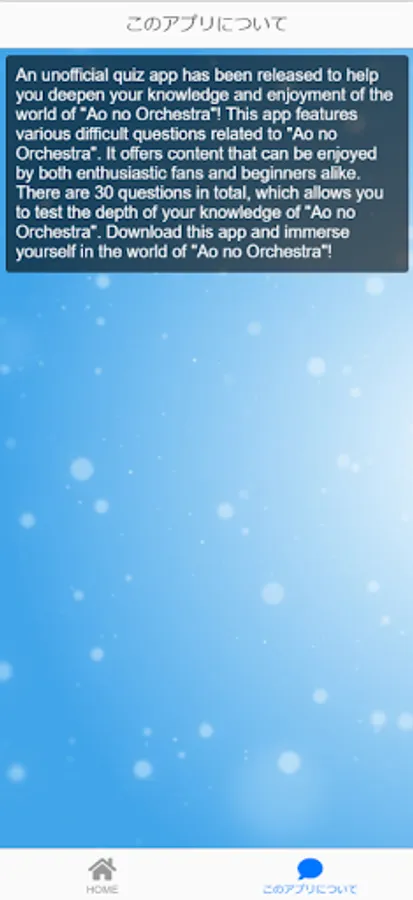 An unofficial quiz app has been released to deepen your knowledge and enjoyment of the world of "Ao No Orchestra"! This app features various difficult questions related to "Ao No Orchestra". It offers content that can be enjoyed by both enthusiastic fans and beginners alike. There are 30 questions in total, which allows you to test the depth of your knowledge of "Ao No Orchestra". Download this app and immerse yourself in the world of "Ao No Orchestra"!