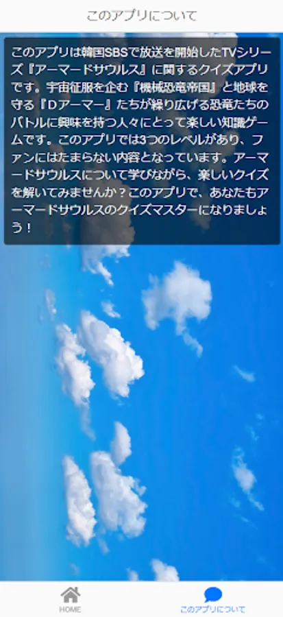 This app is a quiz app on the TV series "Armored Saurus" that started broadcasting on SBS in Korea. This is a fun knowledge game for those who are interested in the battle between the "Dinosaur Machine Empire" who plans to conquer space and the "D Armor" who protects the earth. There are 3 levels in this app, and the content is irresistible for fans. Take a fun quiz while learning about the Armored Saurus! With this app, you too can become an Armored Saurus quiz master!