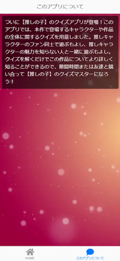 Finally, the quiz app for [Pushing Child] is here! In this app, we have prepared a quiz about the characters that appear in this work and the whole work. You can play with fans of your favorite character, or play with people who don't know the charm of your favorite character. You can learn more about this work just by solving the quiz, so let's compete with your friends in your spare time or become the quiz master of [Oshi no Ko]!