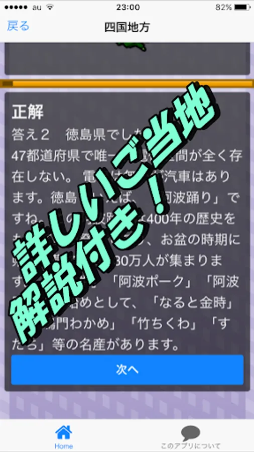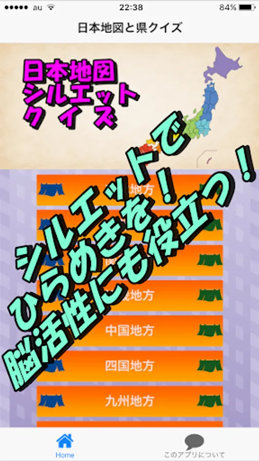 日本地図を地域別に分け県のシルエットから県名を当てるクイズアプリです。