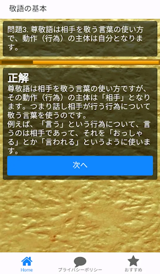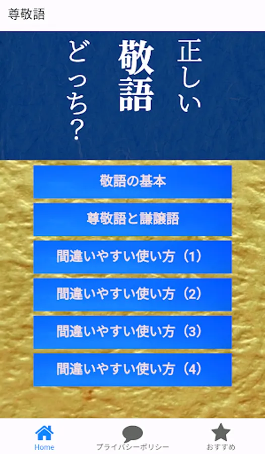 尊敬語、謙譲語、丁寧語の敬語の正しい使い方を確認するアプリです。ビジネスでも必要になりますから、自分の敬語をチェックしてみましょう。