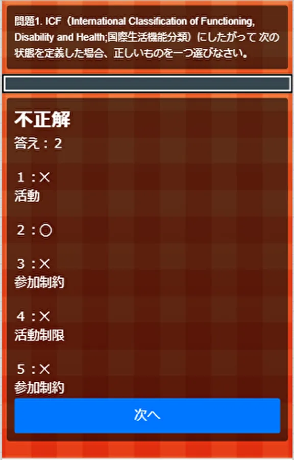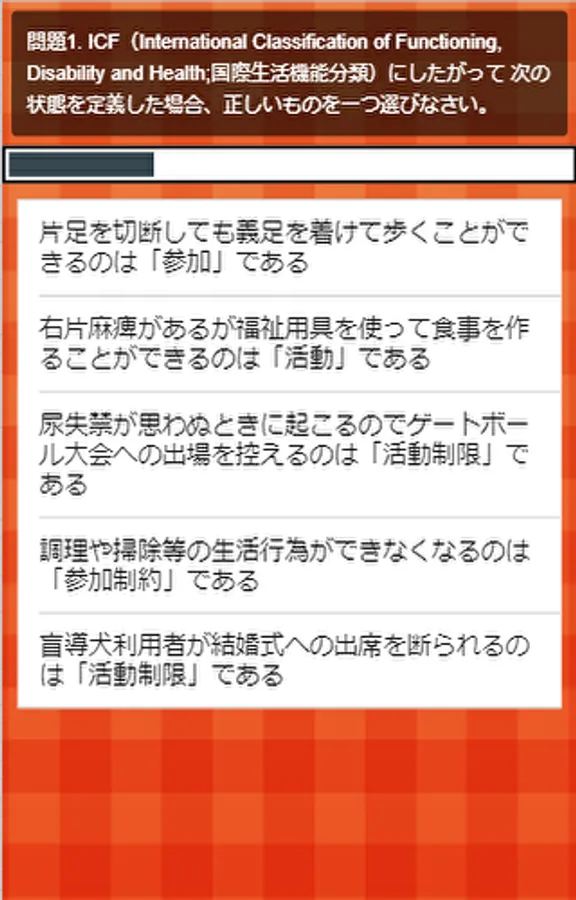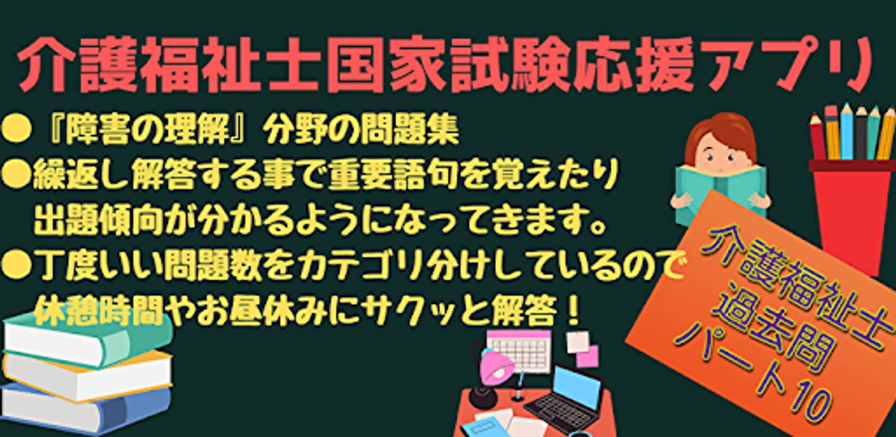 In this app, the field of "Understanding Disabilities" is divided into categories with just the right number of questions. By repeating this, you will be able to learn important words and phrases and understand the tendency of questions. The questions are given so that you can do it quickly during breaks and lunch breaks, so please use it.