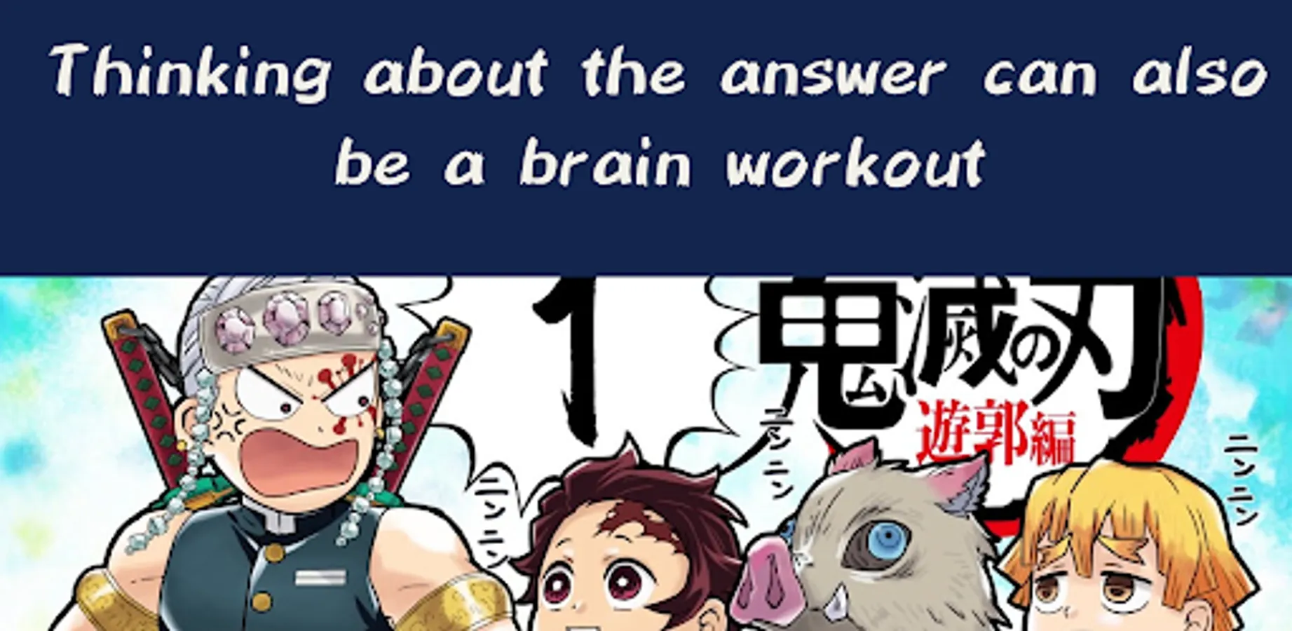 It was an android version Kimetsu no Yaiba quiz. Only problems with a high degree of difficulty, such as problems that do not understand unless you read the manga well. After solving the quiz, you will be able to watch the anime and manga again. Think about the answer, so it's perfect for brain training, so let's have fun while doing brain training. At first, the number of quizzes is small, but later the number of quizzes increases and it is designed to keep you from getting bored. First of all, download it for free and enjoy it.