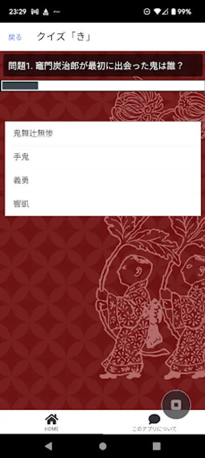 In this app, you can enjoy quizzes on various fields such as the story and characters of "Kimetsu no Yaiba", technology and terminology. When you open the app, the questions are displayed, and questions with higher difficulty are presented from the initial level.