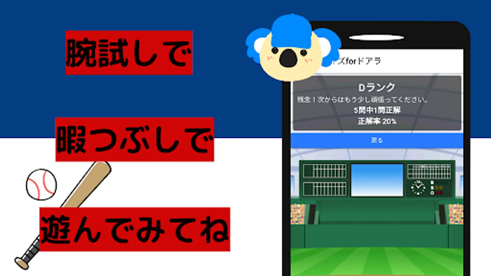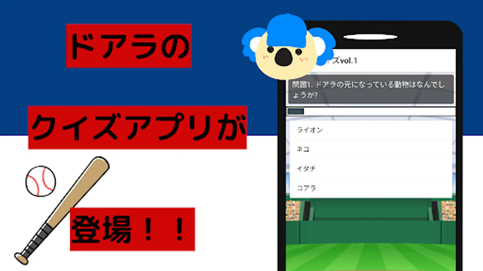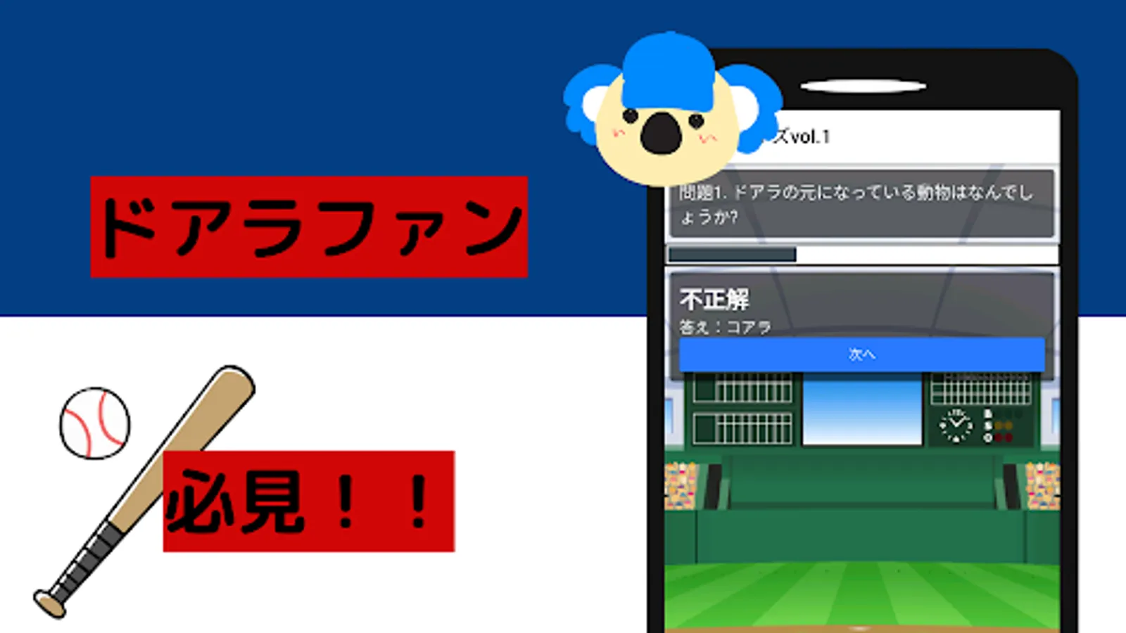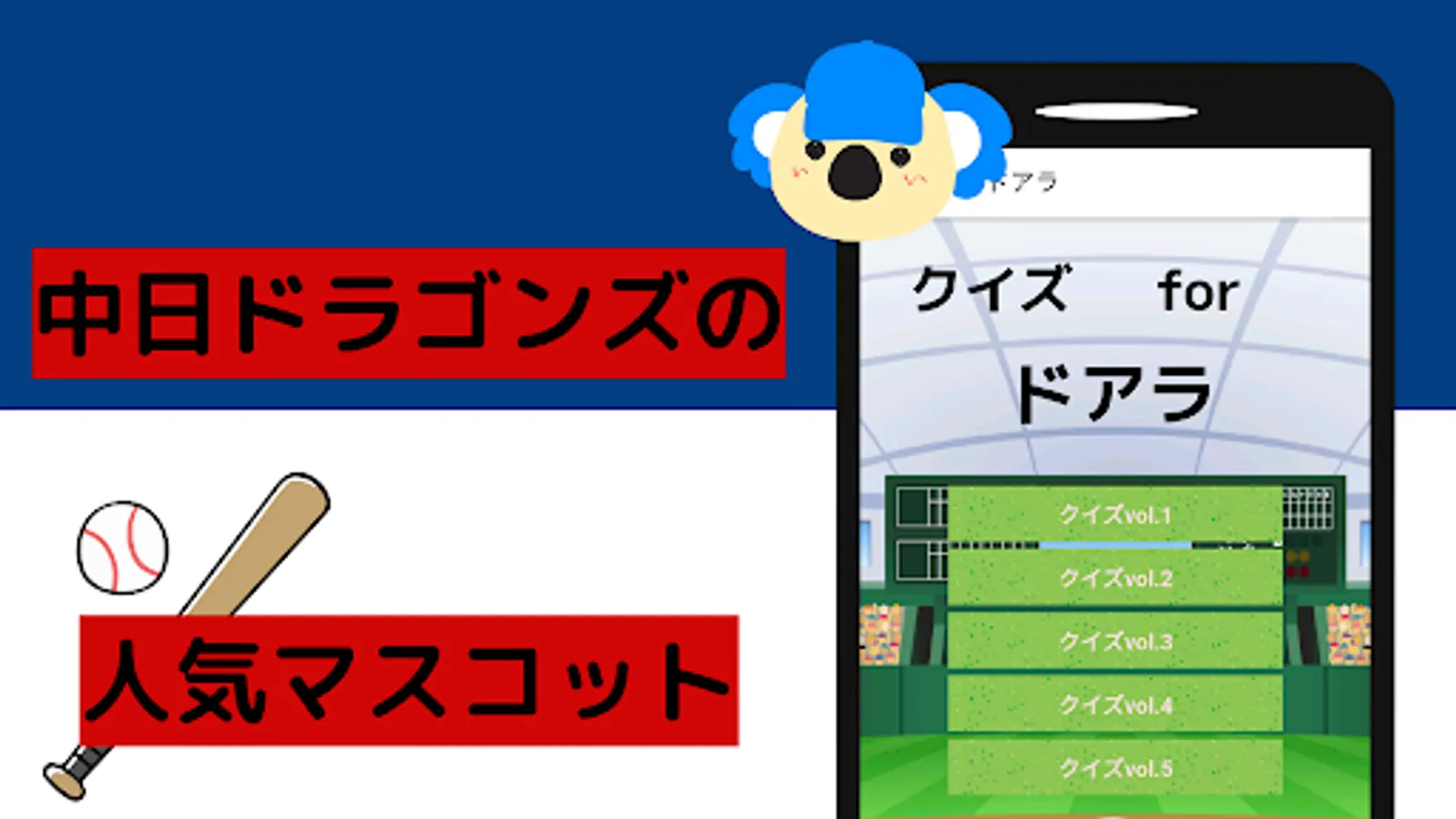 This "Quiz for Doara Baseball Chunichi Dragons" is an unofficial quiz app about "Doara", the popular mascot character of the professional baseball team Chunichi Dragons.