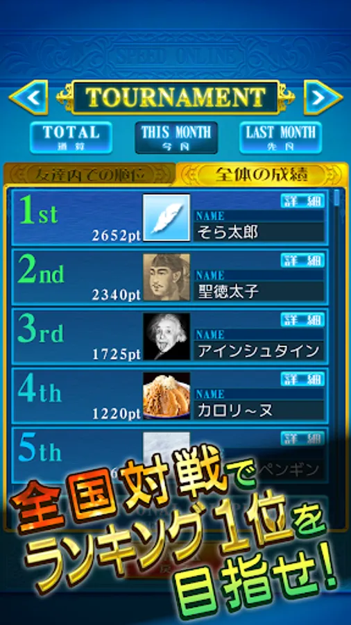Play against players from all over the country. Ranking points will be added by playing national battles, and you can compete with players from all over the country for ranking.
