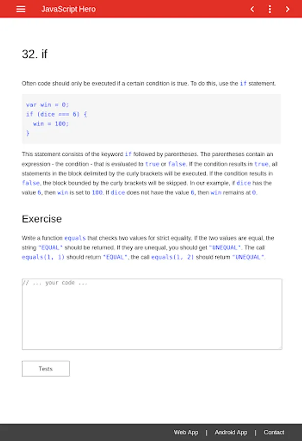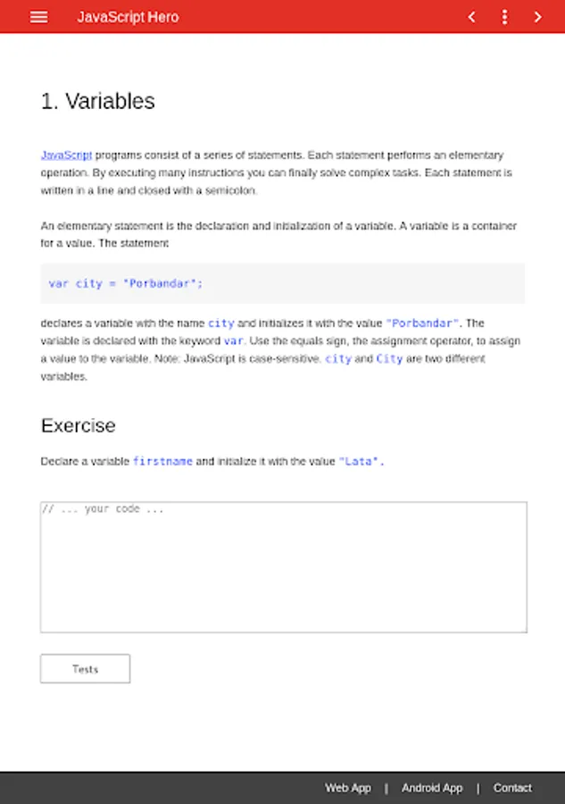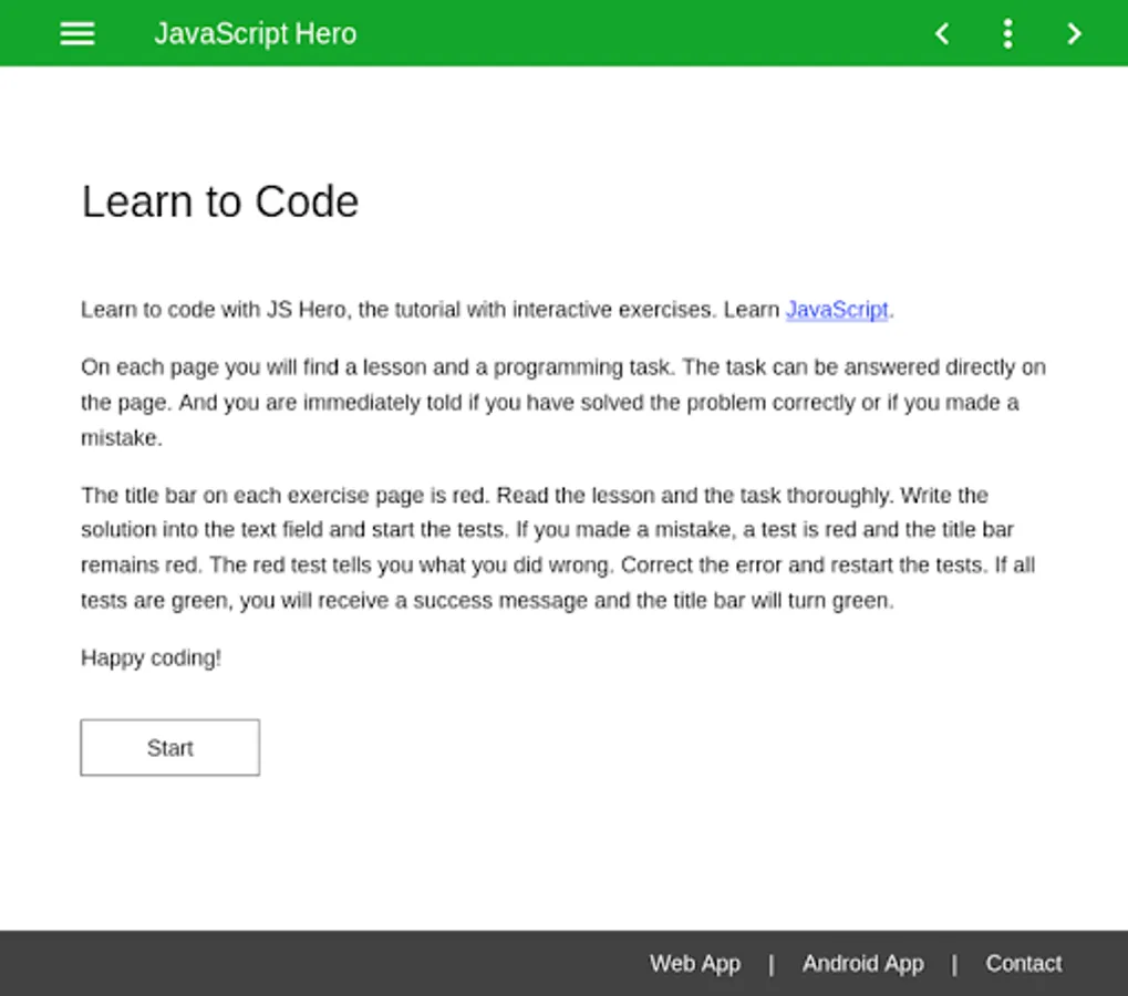 JavaScript Hero wants to take you into the world of JavaScript programming. On each page you will find a small lesson and a small programming task. The task can be solved directly on the page. And you are immediately told if you have solved the problem correctly or if you have made a mistake.