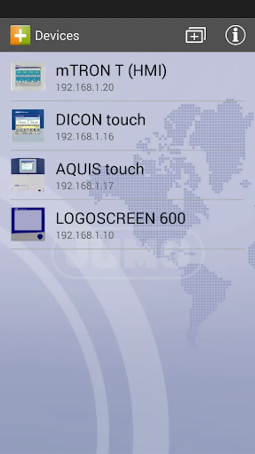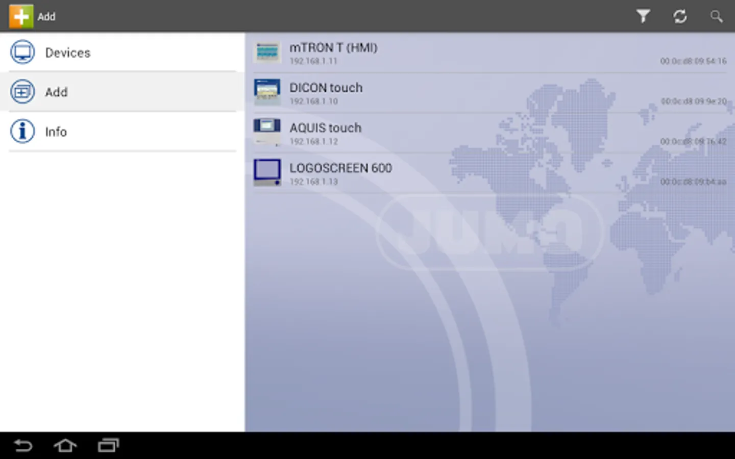 The free JUMO Device app allows smartphones and tablets to communicate with the paperless recorder JUMO LOGOSCREEN 600. The app can scan for devices in the company network and displays the discovered devices in an easy-to-read list. Users can select the device either from this list or do so manually by entering the IP address / DNS designation. If a JUMO device is selected via the app, the device tells the app which data it can provide. This data could, for example, include current measured values, events, or alarms.