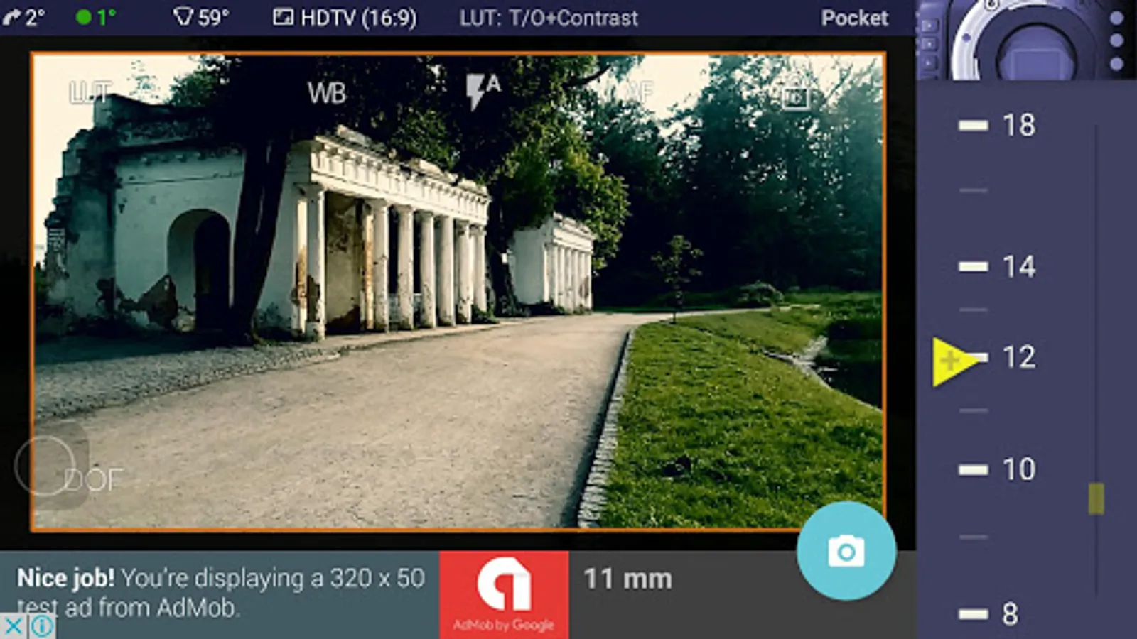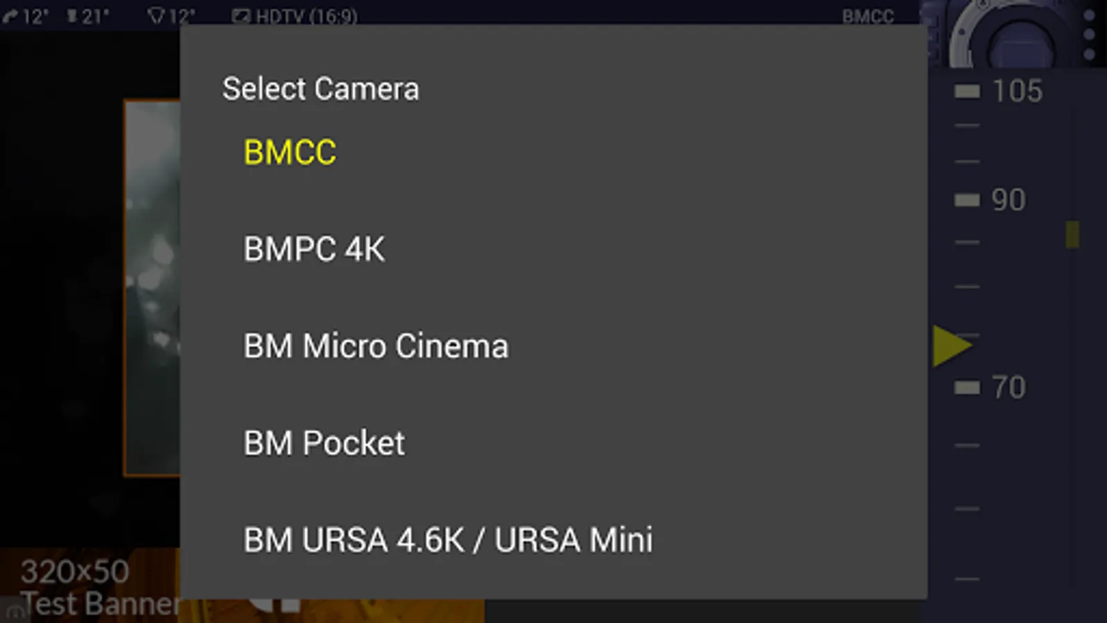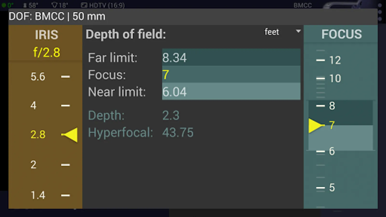 The app is a digital director's viewfinder -- it helps you see the exact field of view for your future shot. Select the camera from the menu and rotate the wheel to select the focal length of the lens.