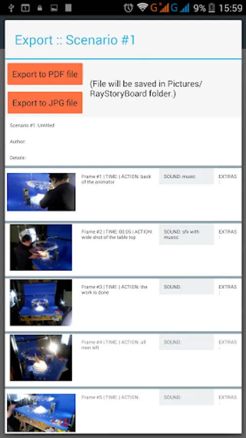 - Export your storyboard to PDF (only for Android OS 4.4+) or JPG file